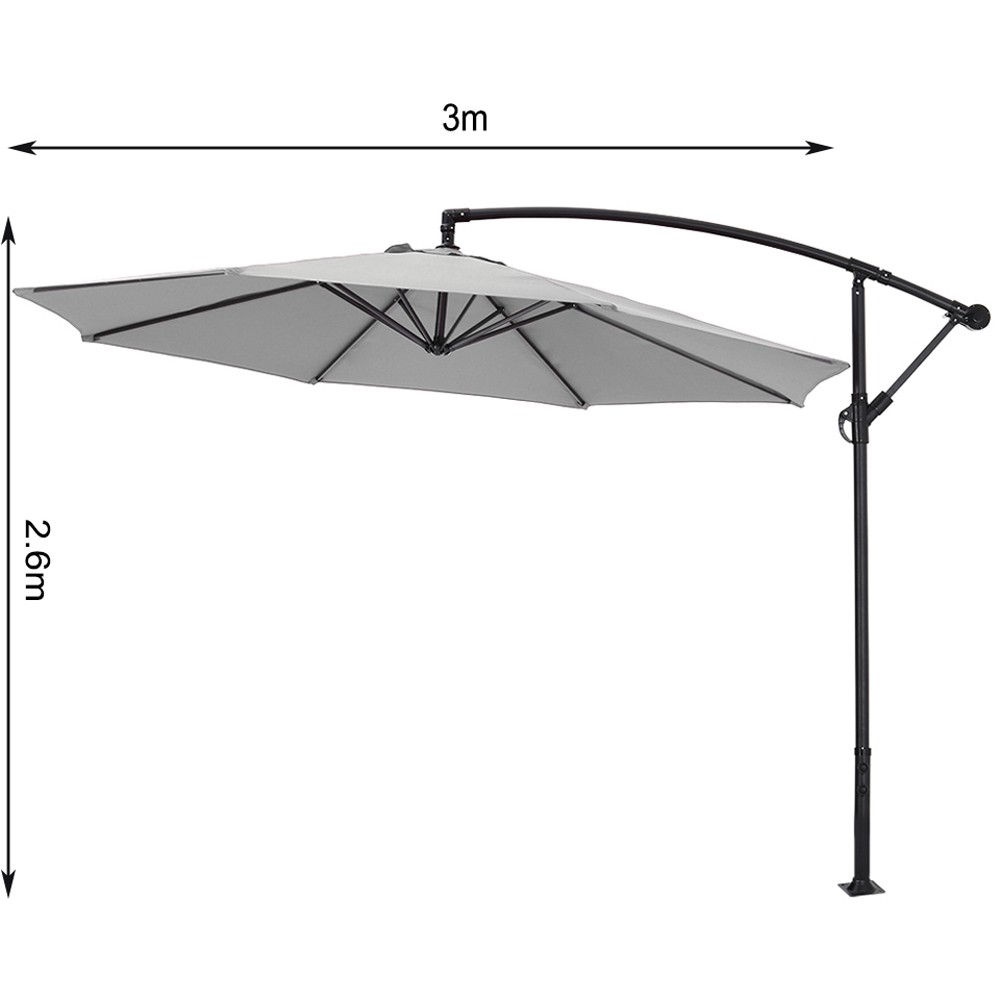 Add a touch of elegance and comfort to your gardens with the Living and Home Light Grey Cantilever Parasol with Square Base 3m. This stylish and functional parasol offers excellent shade, thanks to its large three metre diameter. It’s perfect for relaxing on the patio, hosting outdoor meals, or simply unwinding under the sun. Designed with a sleek, minimalist look, it pairs beautifully with any outdoor dining set. The canopy is made from high-quality 180g polyester fabric, which is waterproof and UV-resistant. It protects you from sudden showers and harmful sun rays, keeping you cool and dry all day. The top vent helps with airflow, preventing the parasol from tipping in light breezes. Featuring a strong 1.0mm thick pole and eight reinforced ribs, this garden parasol is built for stability. The adjustable cantilever design allows you to tilt the canopy easily, giving you flexible shade as the sun moves. For added ease, it comes with a smooth crank winding mechanism, so you can open and close the parasol without any effort. Just lift the slider to extend it outward. Material: 8 ribs, 48/42mm metal pole, 180g polyester fabric cover. Pole: 48 x 1mm. Base: 100 x 100cm. Size: 3 x 2.6m.