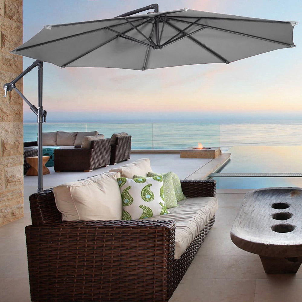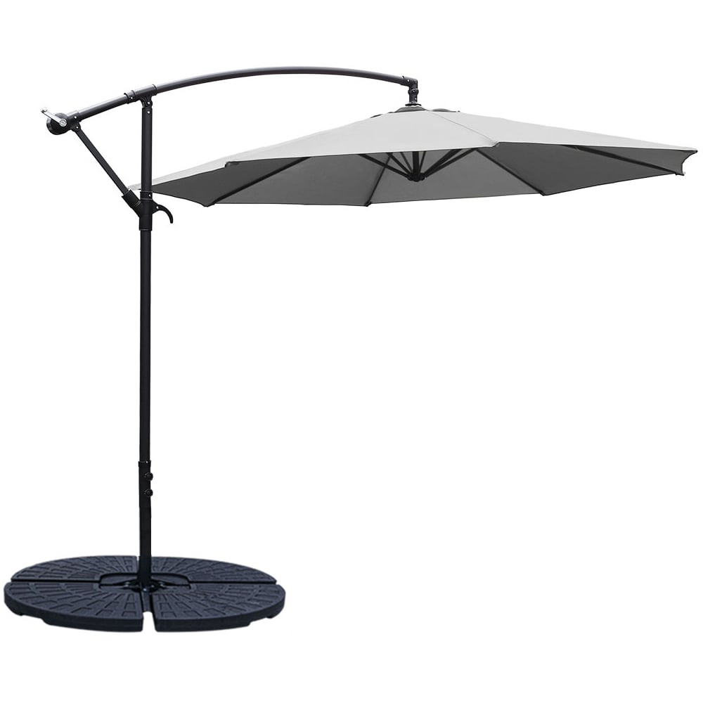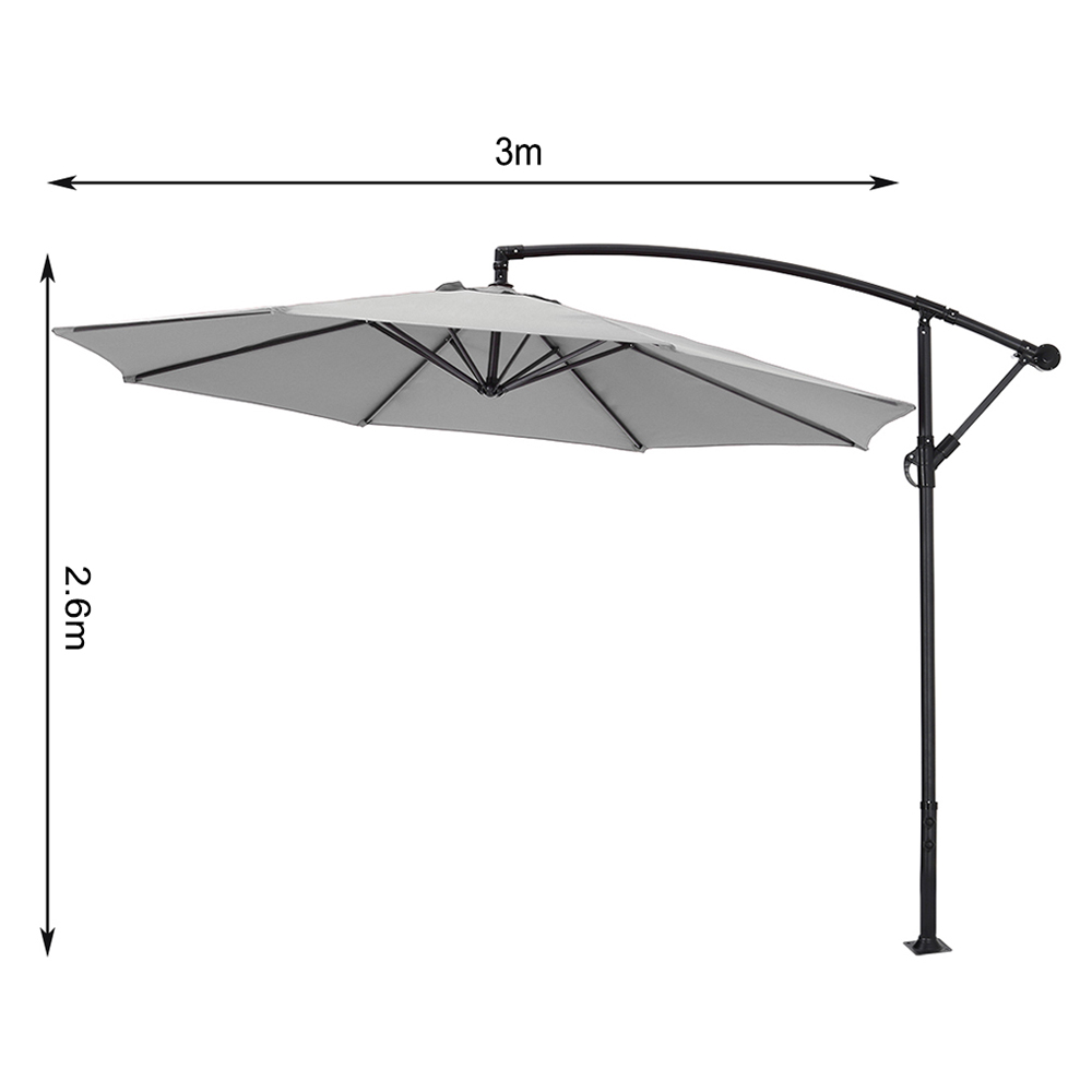 Add a touch of elegance and comfort to your gardens with this Livingandhome 3m Light Grey Garden Cantilever Parasol with Round Base. With this lovely parasol, you can enjoy a comfortable time in your garden. Sturdy and safe, the shade is waterproof and UV-resistant, and it not only provides shelter for you when it rains but also keeps you cool under the hot sun. Featuring high-quality 180g polyester fabrics with top vents and an optional base, this parasol makes a perfect addition to your garden areas. Easy to use, simply lift the slider to extend your parasol outward. Also, with a 3-metre diameter, this hanging garden parasol effortlessly hangs over your dining set or garden setting. Apart from this, it perfectly complements your rattan furniture or outdoor dining table. For added convenience, it includes a crank-winding mechanism to open and close the parasol without hassle. Additionally, the inclination angle of the umbrella is adjustable for maximum ease. Material: 8 ribs, 48/42mm metal pole, 180g polyester fabric cover. Pole: 48 x 1mm. Base: 100cm diameter. Size: 3 x 2.6m. Looking for a way to keep your parasol secure and protected and enjoy some shade? Check out our selection of