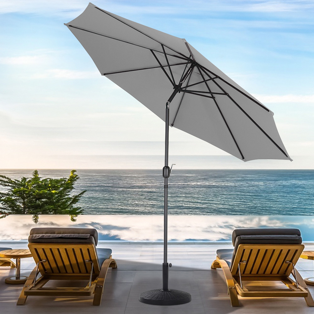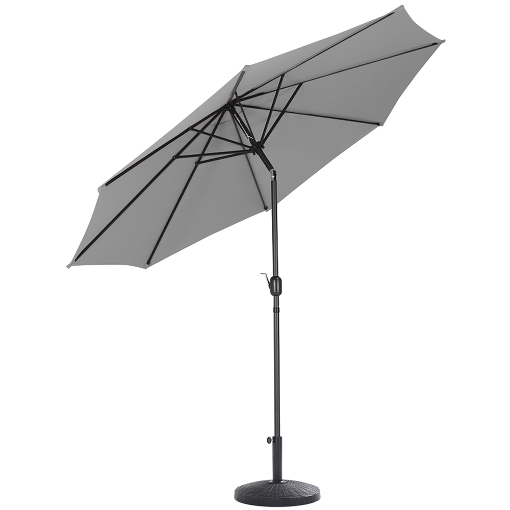 Enjoy your outdoors during those warm, sunny days with Livingandhome 3m Light Grey Round Crank Tilt Parasol with Rattan Effect Round Base. This wide, water-resistant canopy comes with a crank mechanism for added convenience. It shields you and your fellow diners from damaging UV rays in the height of the summer. With high-quality 180G polyester fabrics and top vents - this parasol has a great function of UV protection and water repellant. It also comes with a tilt system for flexibly adjusting the umbrella to block the sunlight in different positions (Tilt 30 degrees vertically, cannot rotate horizontally). It is perfect as a beach umbrella, sun tent, rain shelter and more. Specifications: Material: Aluminium metal pole, 180g/m2 Polyester fabric cover. Steel rib quantity: 8. Aluminium pole diameter: 38mm. Looking for a way to keep your parasol secure and protected and enjoy some shade? Check out our selection of