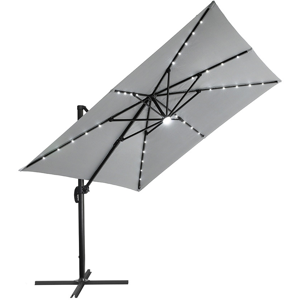 Escape the sun in style with this Cantilever Parasol. Crafted from a durable metal frame, this octagonal parasol is designed to provide shade on hot, sunny days. Its weather-resistant polyester canopy ensures it can withstand all sorts of weather, making it perfect for outdoor use. The convenient crank mechanism and adjustable handle allow you to effortlessly customize the shading angle. Each rib is equipped with LED light strip, lighting up your outdoor enjoyment at night. Better yet, this set contains a base that is not only good-looking but also supportive. It includes a 92L four-piece base.
