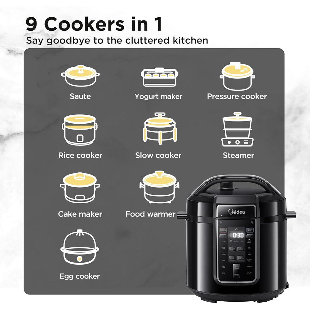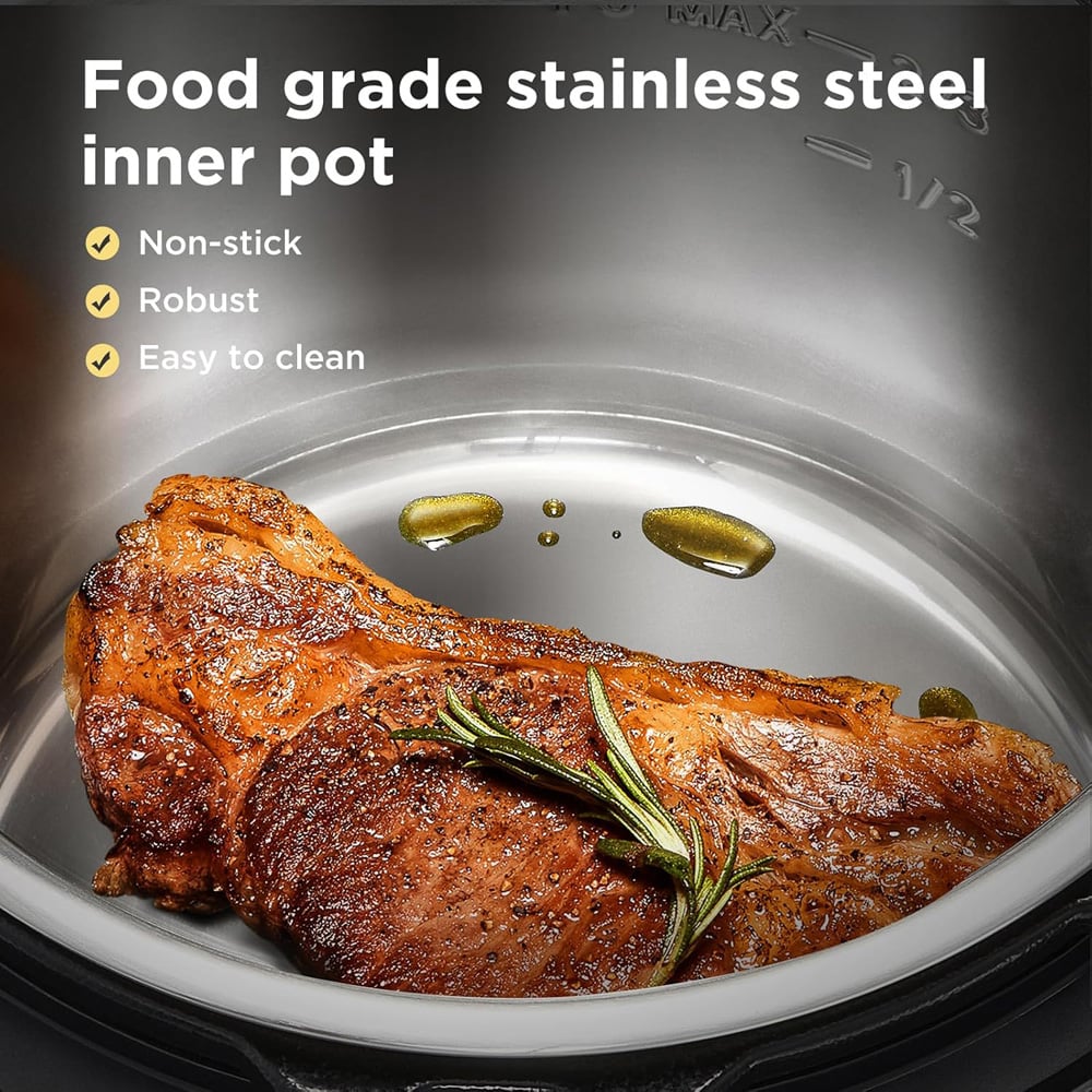 Transform meal prep with a 6 litre multi function pressure cooker for rice and yogurt that effortlessly blends nine appliances into one, offering everything from pressure cooking and steaming to baking and sautéing, all in a sleek black finish. Enjoy the ease of thirteen smart presets and a digital display that simplify daily cooking, while the stainless steel non-stick pot ensures quick clean-ups. With a powerful 1200W motor, high-pressure function and a 24-hour delay timer, you'll save time and enjoy delicious results, all with built-in safety features like overheat protection and a secure lid lock for peace of mind.