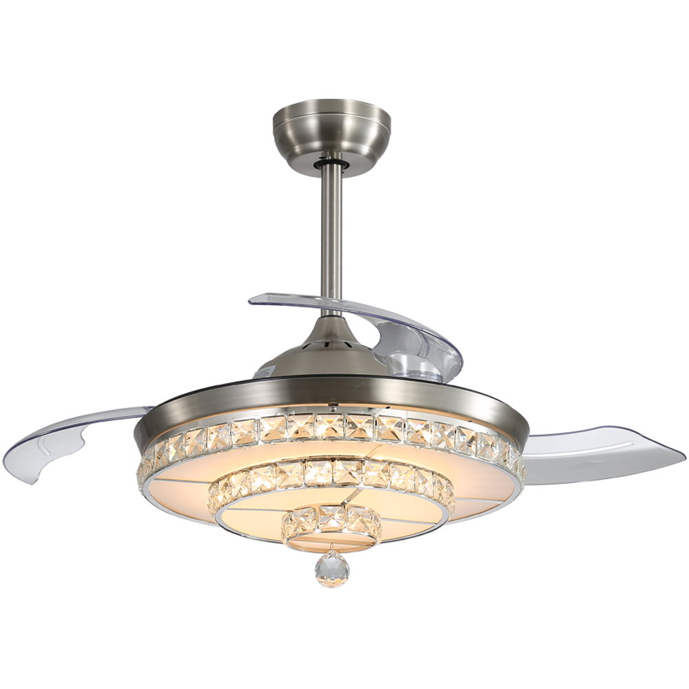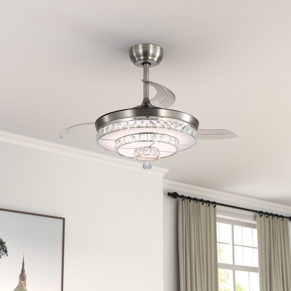 Elevate your home living experience with this LED fan light, a game-changer in home comfort. Crafted with precision, the lampshade boasts fine crystal and solid metal, and the blades feature durable acrylic, creating a show-stopper in your living space. Its triple-layer LED lights offer bright illumination, simultaneously cooling your room and enhancing airflow throughout the year. With memory and timing functions, safety is assured, even while you are asleep. You can choose from 6 wind speeds and 3 light temperatures via the easy-to-use remote control.