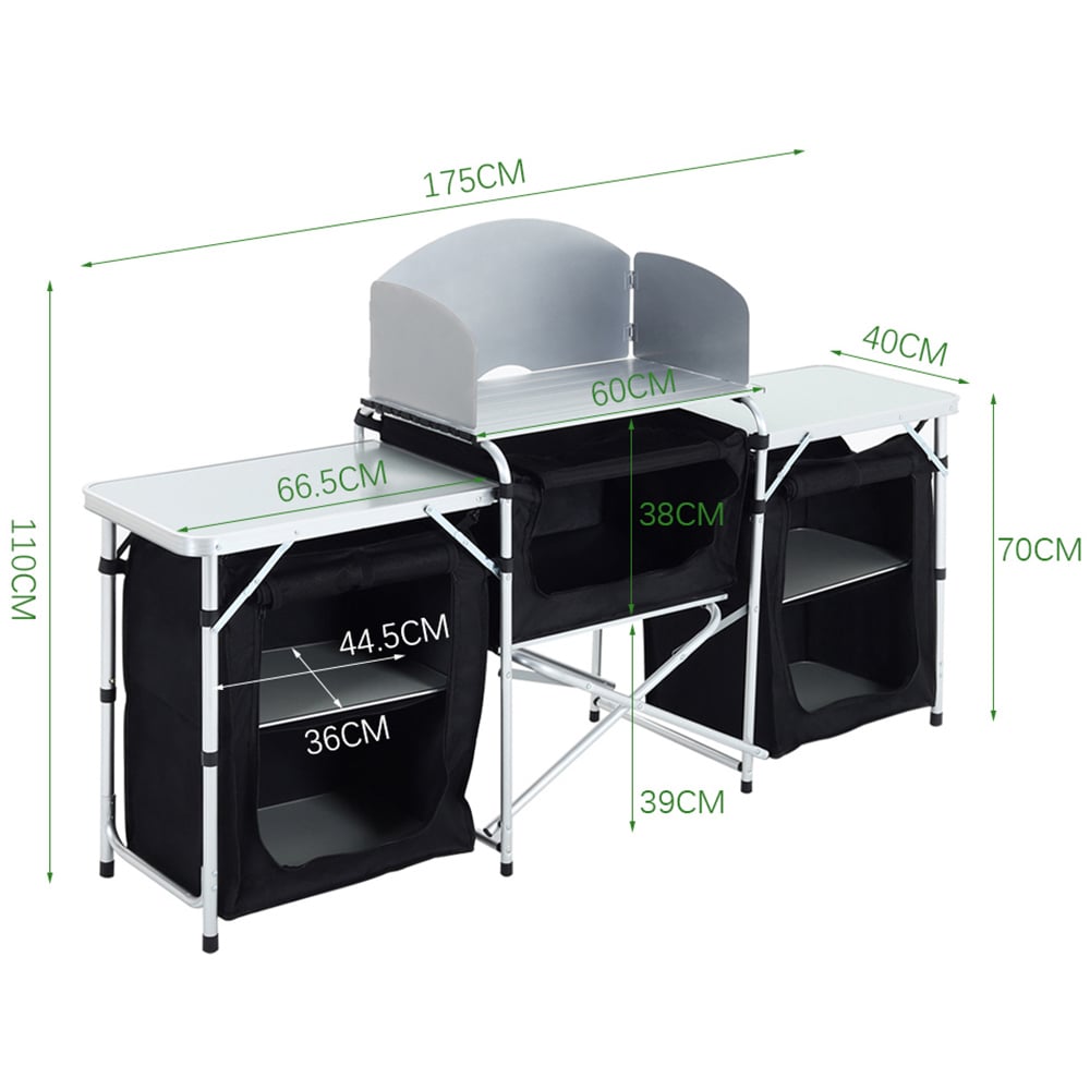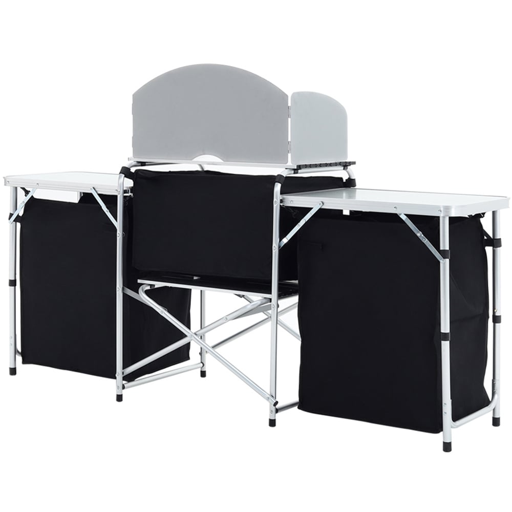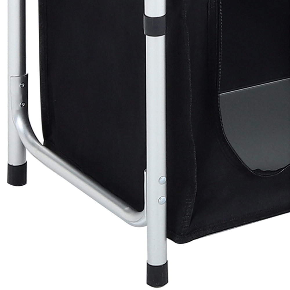 Transform any outdoor space into your personal haven with the Living and Home Portable Black Camping Kitchen Stand. The sturdy aluminium frame ensures stability when setting up your kitchen, while the durable MDF tabletop provides a reliable prep surface. Safety is prioritised with child-friendly rounded corners and anti-slip rubber feet. The built-in zippered storage compartment provides ample space to store all essentials. The whole thing folds up easily for convenient transportation.