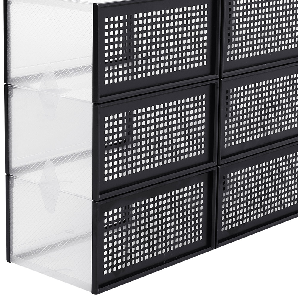 Add convenience to your home with the Living and Home Set of 12 Clear Plastic Stackable Shoe Storage Box. These clear shoe storage boxes are ideal for one-step organisation, achieving a neat and orderly setting. You can seamlessly combine multiple shoe boxes by stacking to optimize space utilization. The boxes feature a transparent design that displays your footwear collection and streamlines selecting the perfect pair for the day. It ensures your shoes of any size or for any season are well-preserved storage and extend their longevity. The box measures 18 x 34 x 24cm.