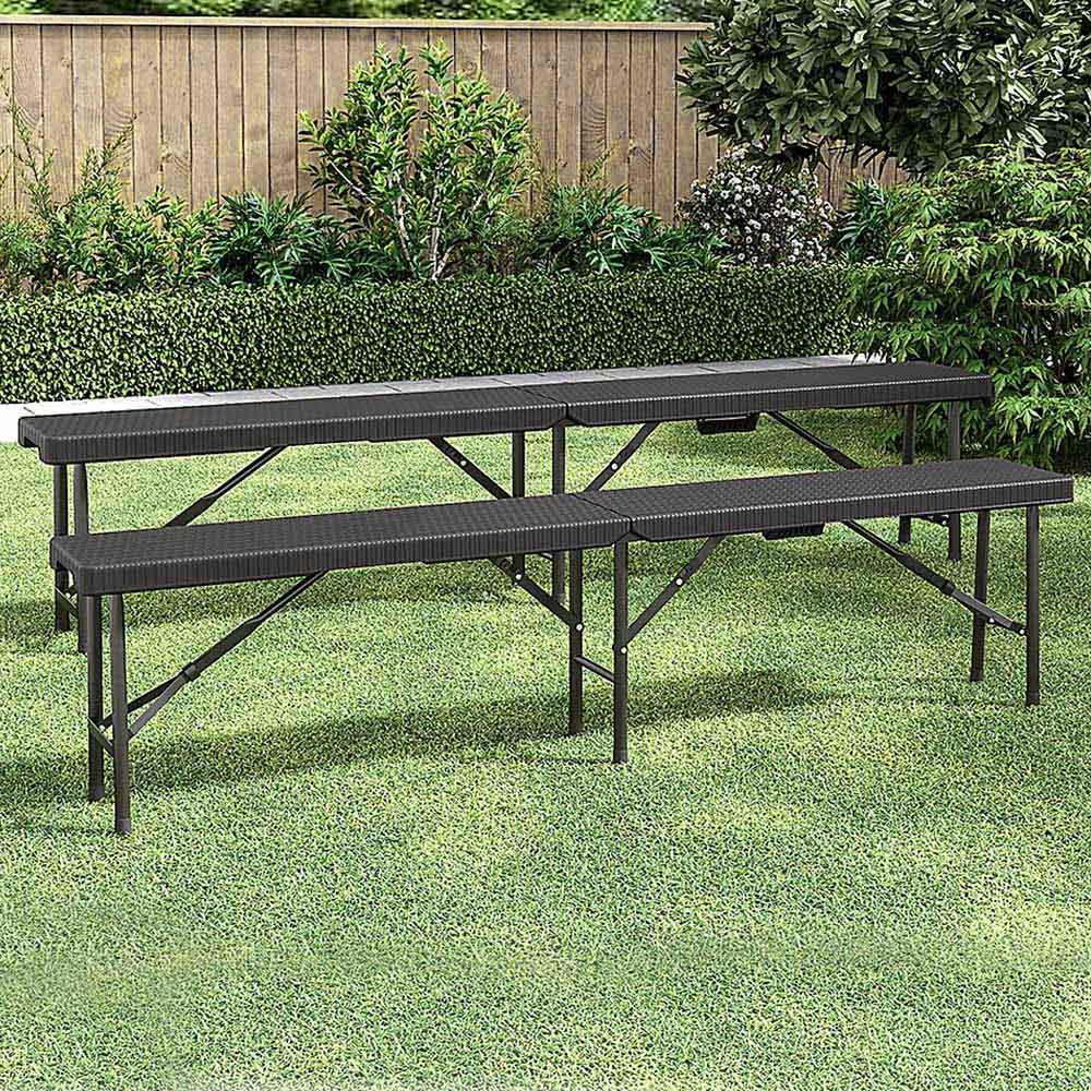 Enjoy your outdoor time with Living and Home Set of 2 Rattan Black Folding Bench. It can be perfect for picnics, parties, and camping trips. With a length of 180cm, it can comfortably accommodate 3-4 people. It is easy to care for with its plastic and metal construction and is weather resistant. The benches can be easily folded down when not in use and are easy to carry thanks to the built-in handle on the side.