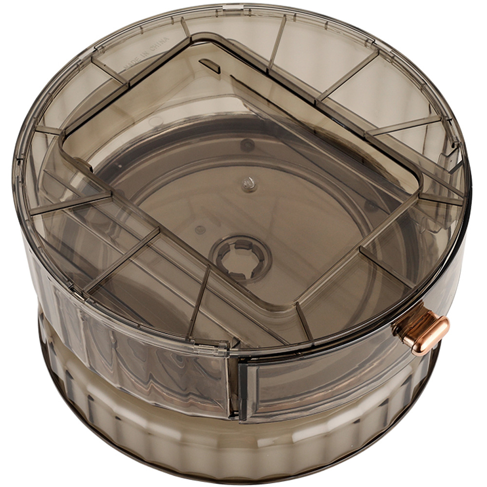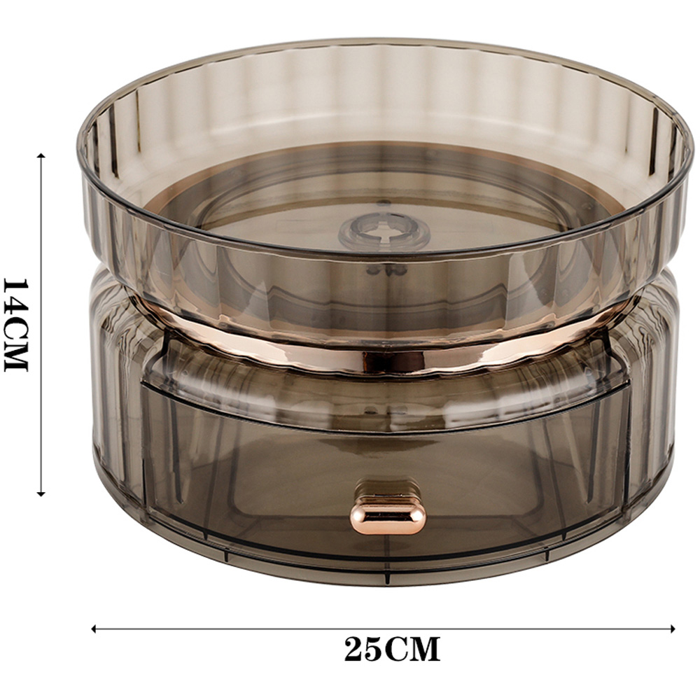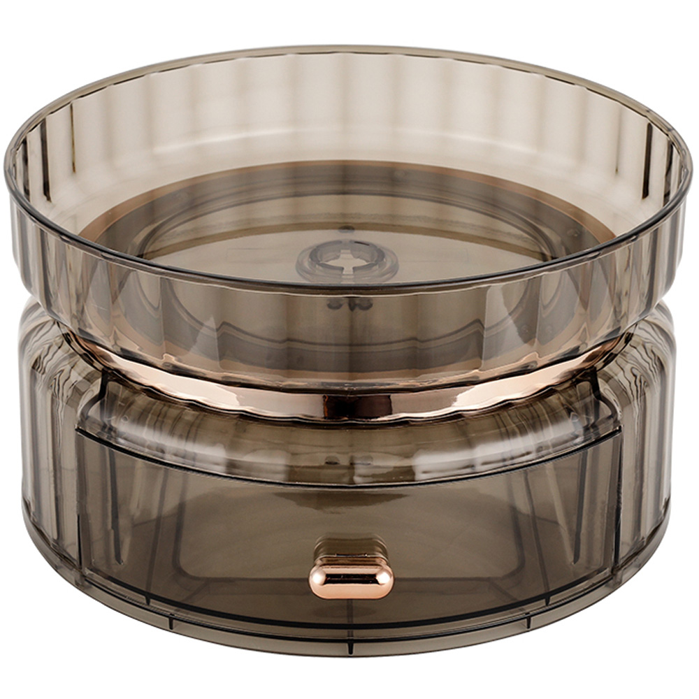 Bid farewell to cluttered desktops with this sleek makeup organiser. Crafted from translucent PET material, its surface boasts a channel design, creating an overall elegant and simple cylindrical shape. The top tier offers an open space, accommodating supplies of varying heights. Plus, it rotates 360 degrees, simplifying your daily makeup and skincare routines. Below, the drawer provides additional storage, ensuring cosmetics stay organised and in optimal condition. This makeup organiser combines functionality with a stylish design to be your best pick.
