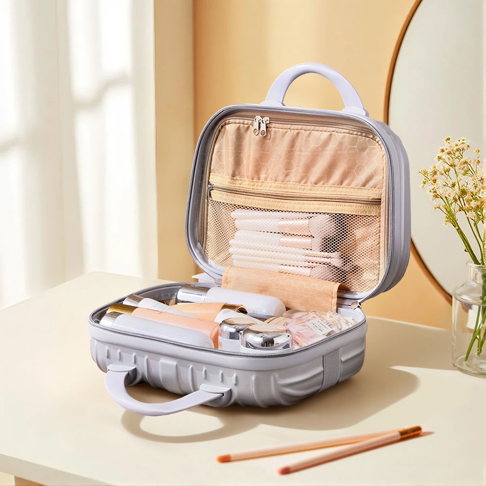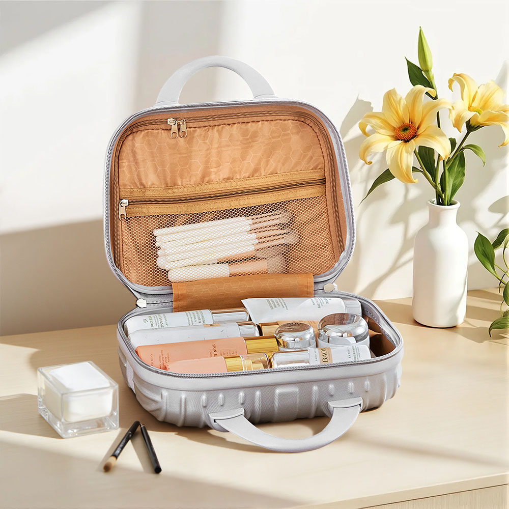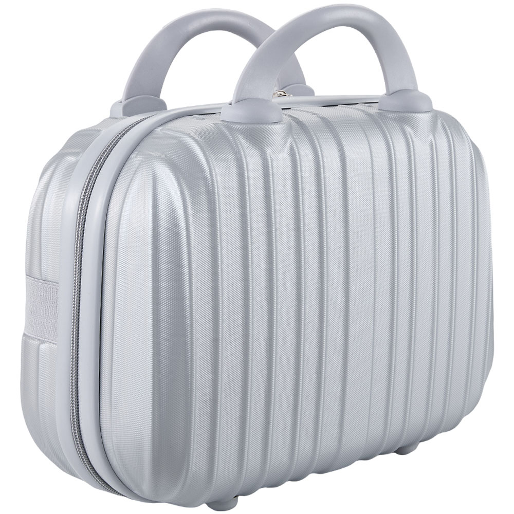 Step into your next adventure with a portable hard shell cosmetic travel case with compartments 30cm, designed to keep makeup and beauty essentials neatly organised and protected wherever you go. Crafted from sturdy ABS in a sleek silver finish, it resists bumps, dust and moisture while the vertical grooves add a modern touch. Inside, a soft polyester lining and thoughtful compartments make sure everything stays scratch-free and easy to find, whether it's a weekend getaway or an extended journey. Scratch-resistant feet and a handy elastic strap for suitcase attachment make travel even smoother, and the compact size with sturdy handles means you can carry your style anywhere.