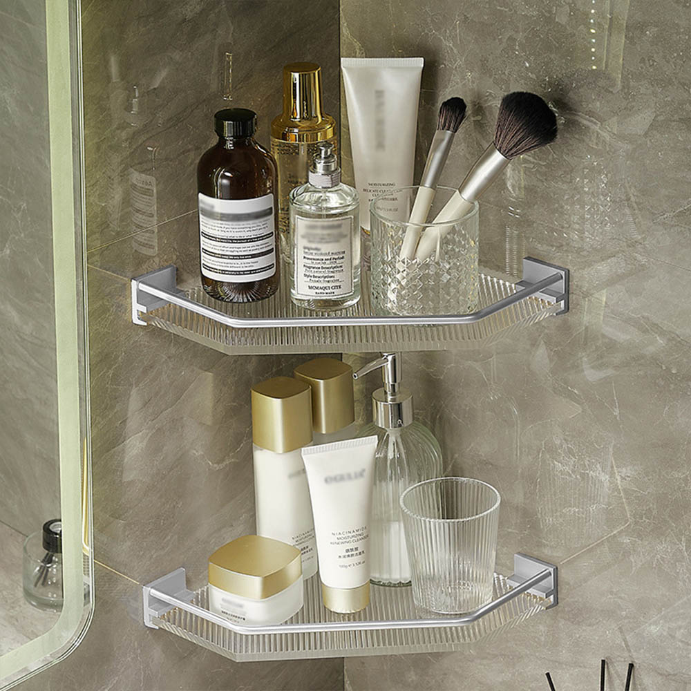 Organise your bathroom effortlessly with this Living and Home Acrylic Bathroom Corner Shelf. An acrylic and aluminium construction, the shelf is waterproof, wear-resistant and anti-ageing in nature. And with the flat bottom and heightened guardrail, all the products are sure to remain secure on the shelf. With the included mounting hardware, it is easy to mount at any position on the wall so that the care products are always within easy reach. Dimensions: 31 x 23 x 5cm.