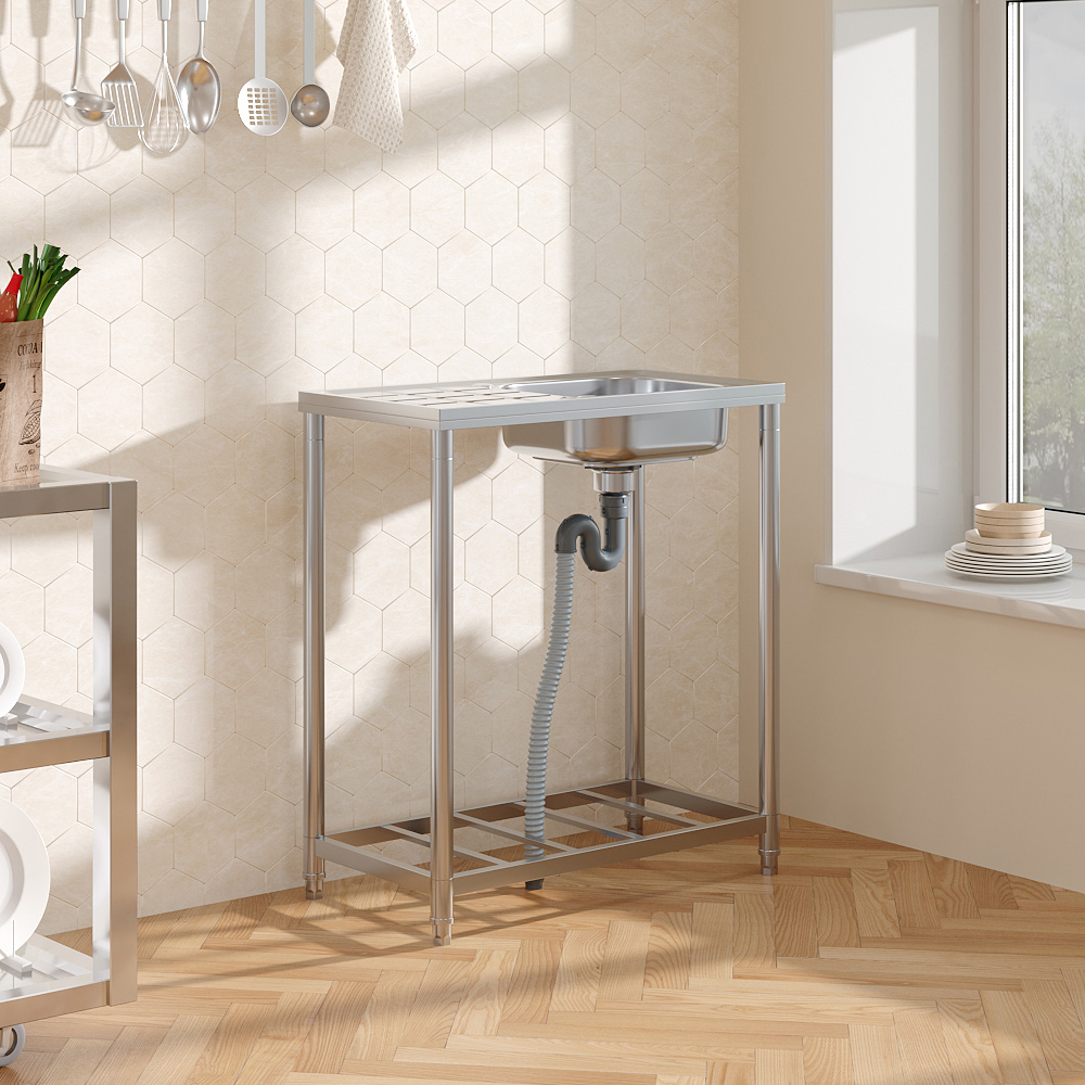 Enhance your kitchen with this highly functional and spacious commercial stainless steel sink, designed to handle all your washing needs with ease. Ideal for home kitchens, restaurants, and outdoor setups, this sink combines durability with practicality, ensuring seamless use in various environments. Made from premium stainless steel, it resists scratches, dents, and corrosion while upholding food-safe standards. The integrated drainboard on the right side provides a convenient space for drying dishes, utensils, and cookware, adding to its efficiency. With its easy installation and movable design, this sink is a versatile and indispensable addition to any workspace.