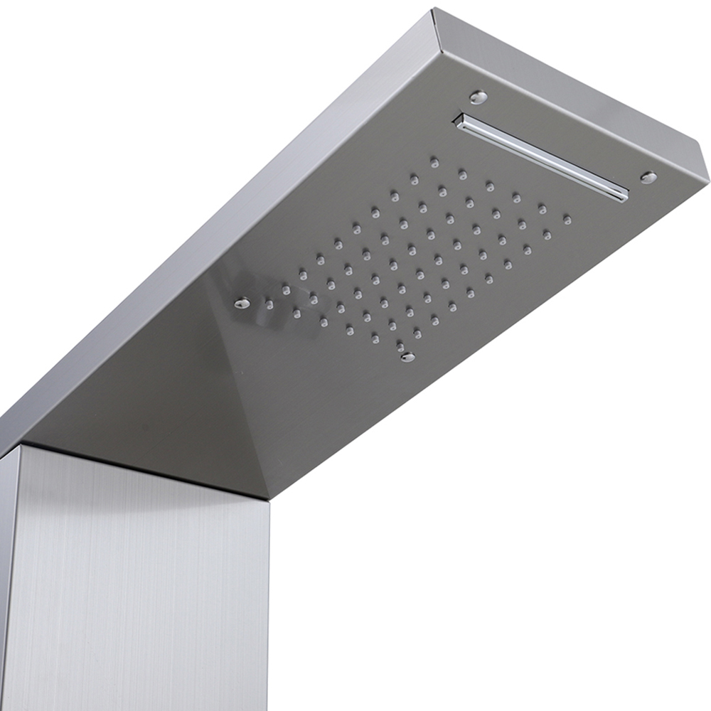 Elevate your shower experience with the Living and Home Stainless Steel Wall Mount Shower Panel Tower System. This stylish unit combines a waterfall shower head, two soothing massage jets, a tub spout, and a flexible hand shower, ensuring a comprehensive and luxurious bathing experience. With its five-function design, it caters to all your showering preferences, providing a spa-like experience in the comfort of your own home. The flexible hand shower comes with a high-density stainless steel hose, providing durability and convenience. Constructed from premium materials, this shower panel is designed to withstand the test of time, and its built-in shelf offers easy access to your bathroom essentials. The sleek silver finish adds a modern touch, making this shower panel an ideal choice for contemporary bathrooms.