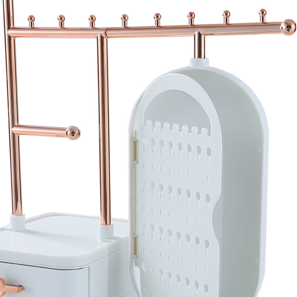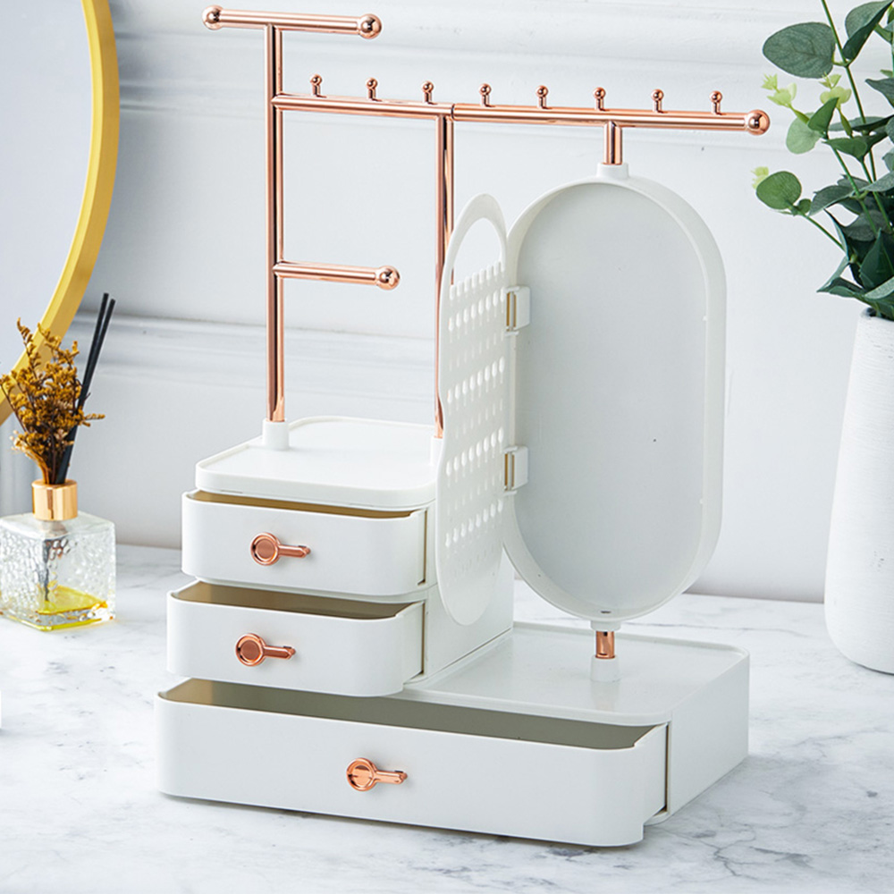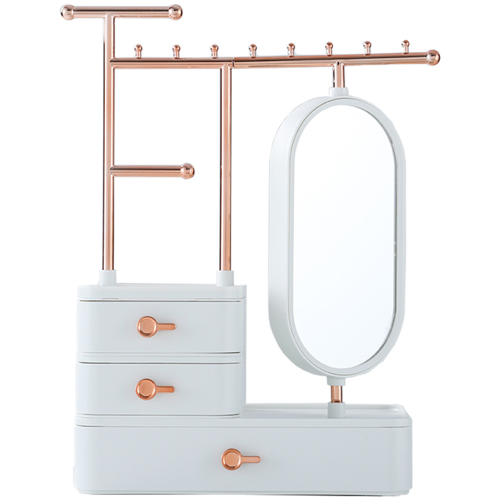 Step up your beauty game with this Living and Home White Jewellery Makeup Storage Box with Mirror. The modern jewellery box comprises upper rods, three drawers and a high-definition mirror that opens to showcase a hidden earring holder. With sufficient storage, this dustproof and waterproof makeup box will help you keep your jewellery tidy and organized. Dimensions: H37.5 x L25 x W15cm.