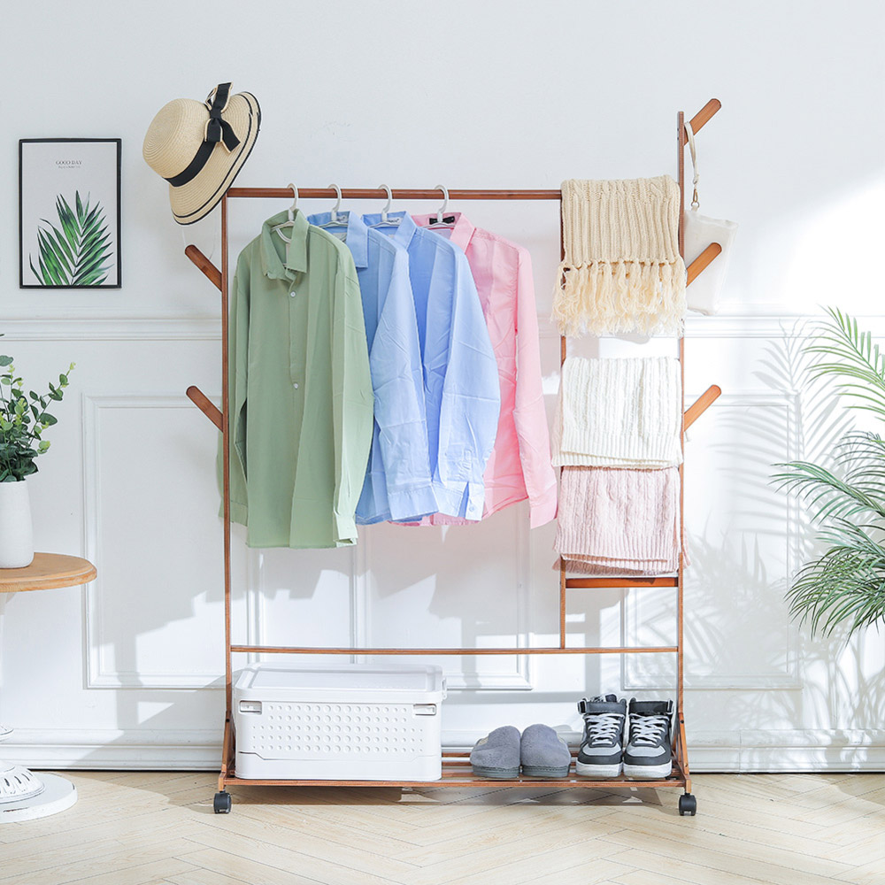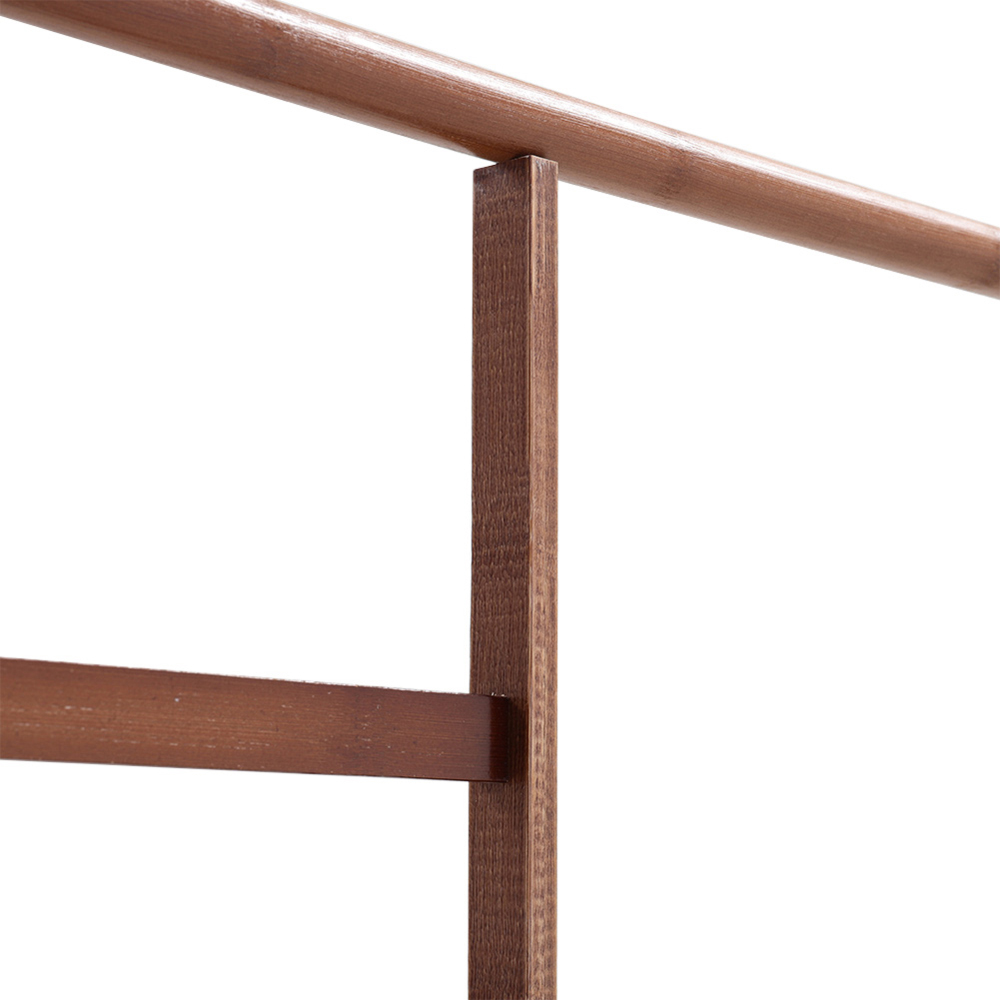 Organise your clothes with style and ease with this Living and Home Brown Bamboo Clothes Rack. Made of premium bamboo, the rack features a non-toxic, anti-corrosion varnish-finished frame with a top rod and hollowed bottom shelf. Wheels equipped underneath make movement convenient, and the triangle bottom structure ensures stability and firmness. The stand has a great bearing capacity and gives more storage options to hang long pants, overcoats, and dresses. The sunken screw holes and well-polished bamboo help prevent any possible scratches. With versatile and multi-functional features, it can be used in a hallway, bedroom, living room or balcony. Dimensions: H155 x W100 x D35cm.
