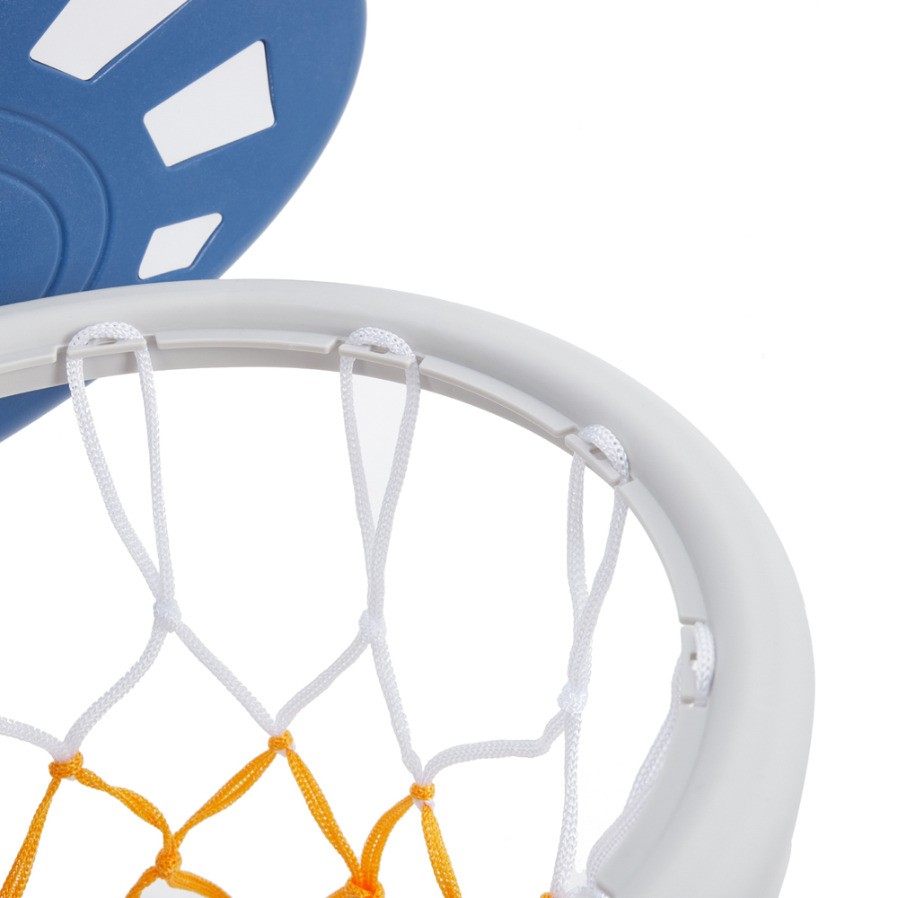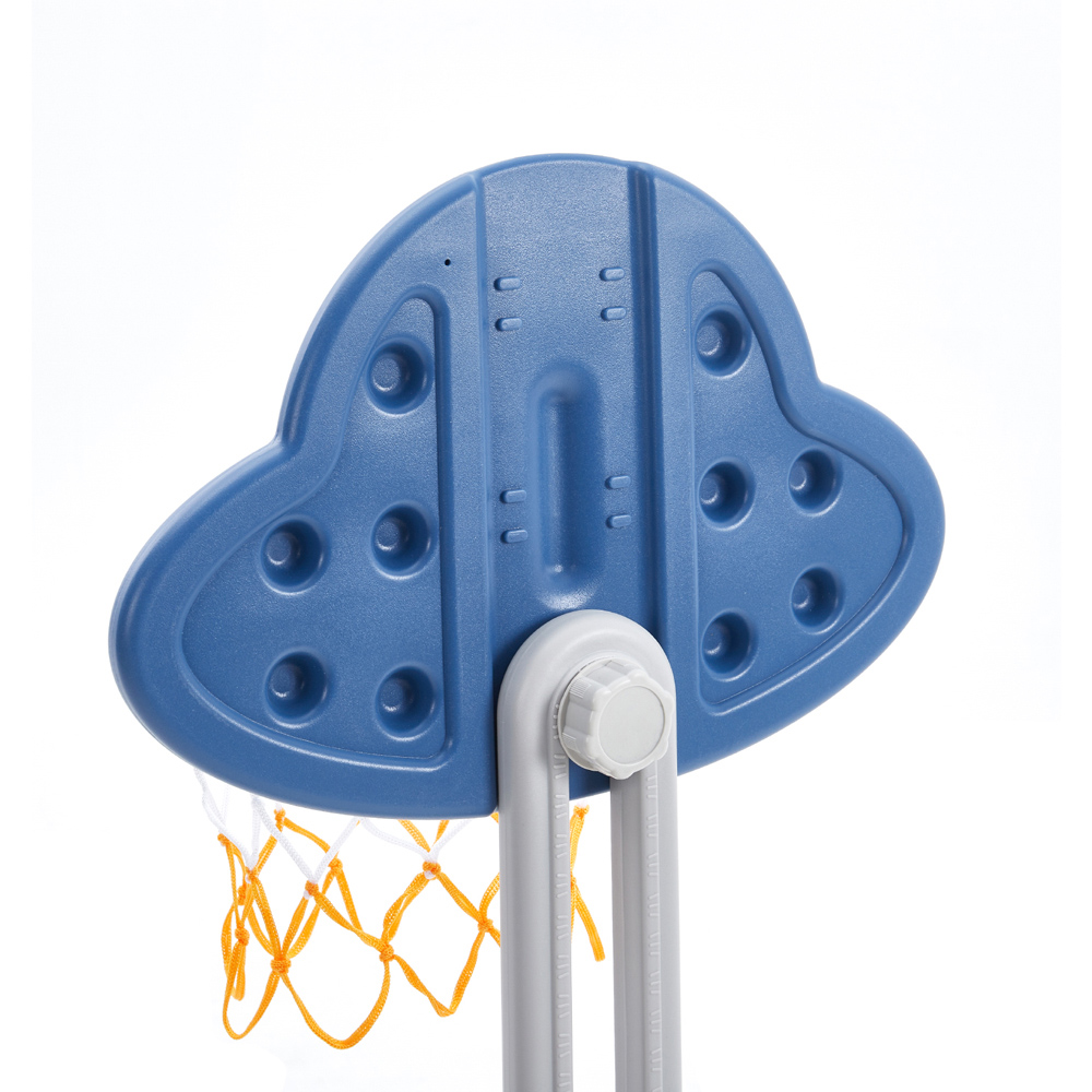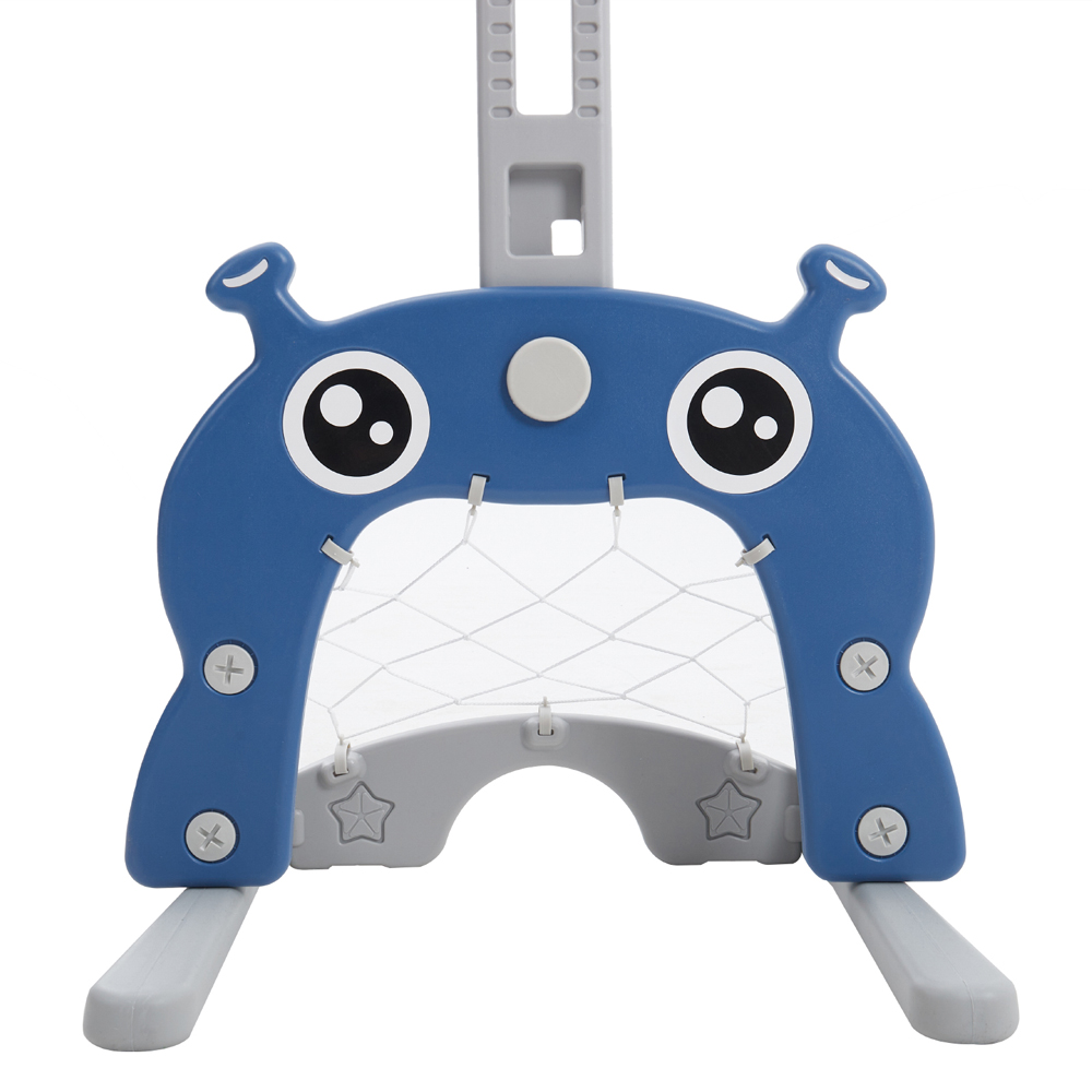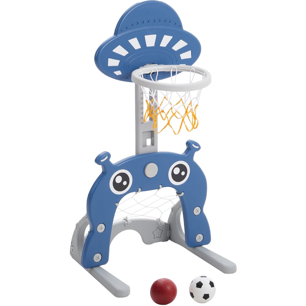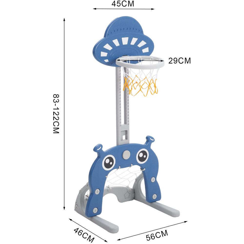 Elevate your child's playtime with the Living and Home Navy Toddlers 2 in 1 Adjustable Basketball Hoop and Football Goal Set. This versatile and interactive set is designed for young children. It features a sturdy base and adjustable height, making it perfect for children of different ages and heights. The set is made of durable plastic and comes with a mini basketball and a football, making it a great way to encourage physical activity and develop hand-eye coordination. It has an UFO design that kids will love. The set can be used indoors and outdoors. Additionally, the base can be filled with sand or water for stability.