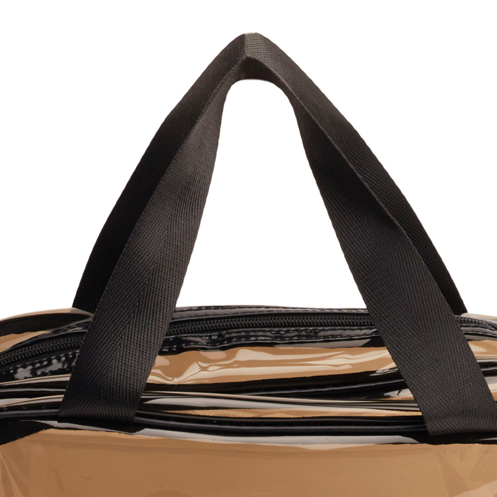 Whether you are on the go, traveling, or hitting the gym, this spacious makeup bag allows you to carry all your necessities. Crafted from brown transparent PVC material, it exudes a trendy and airy vibe, showcasing meticulous craftsmanship for waterproofing and resilience. It incorporates two compartments for separating dry and wet items, making it easy to distinguish toiletries from wet towels or clothes. Soft and easily compressible, it truly is a versatile accessory suitable for any setting.