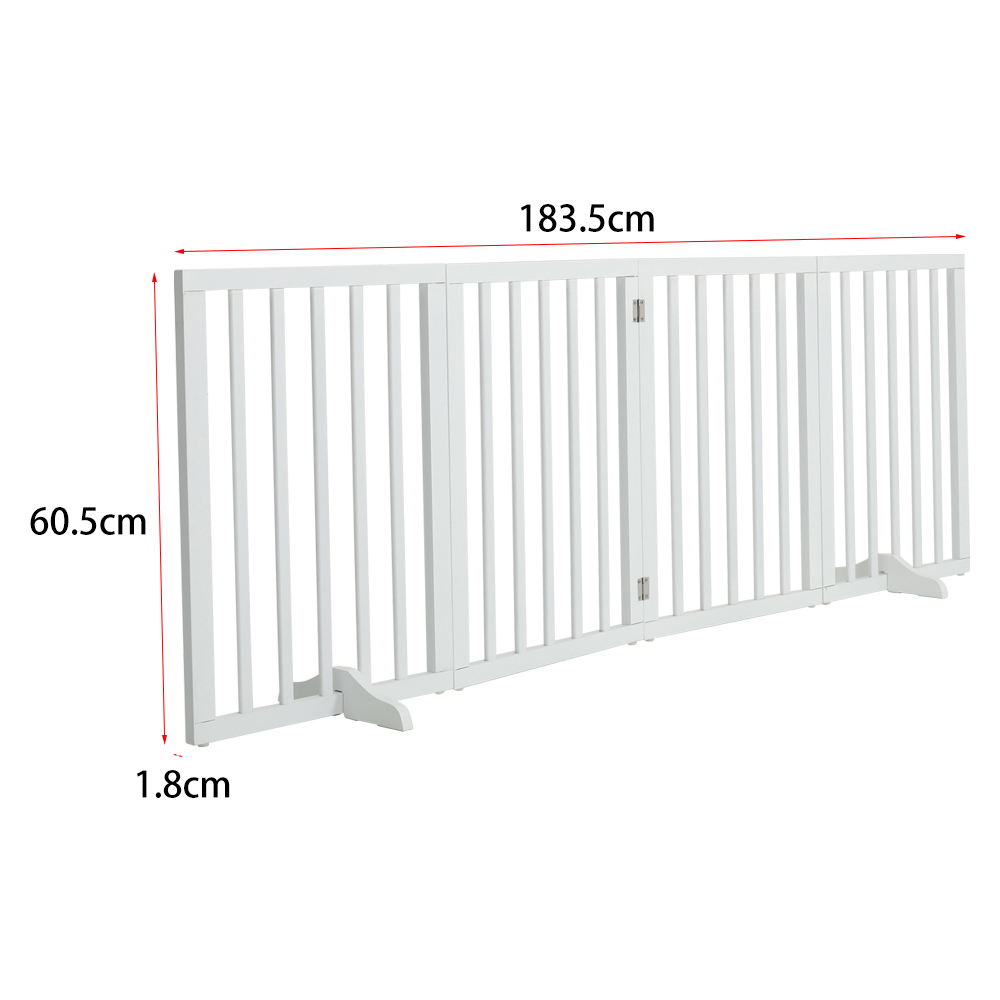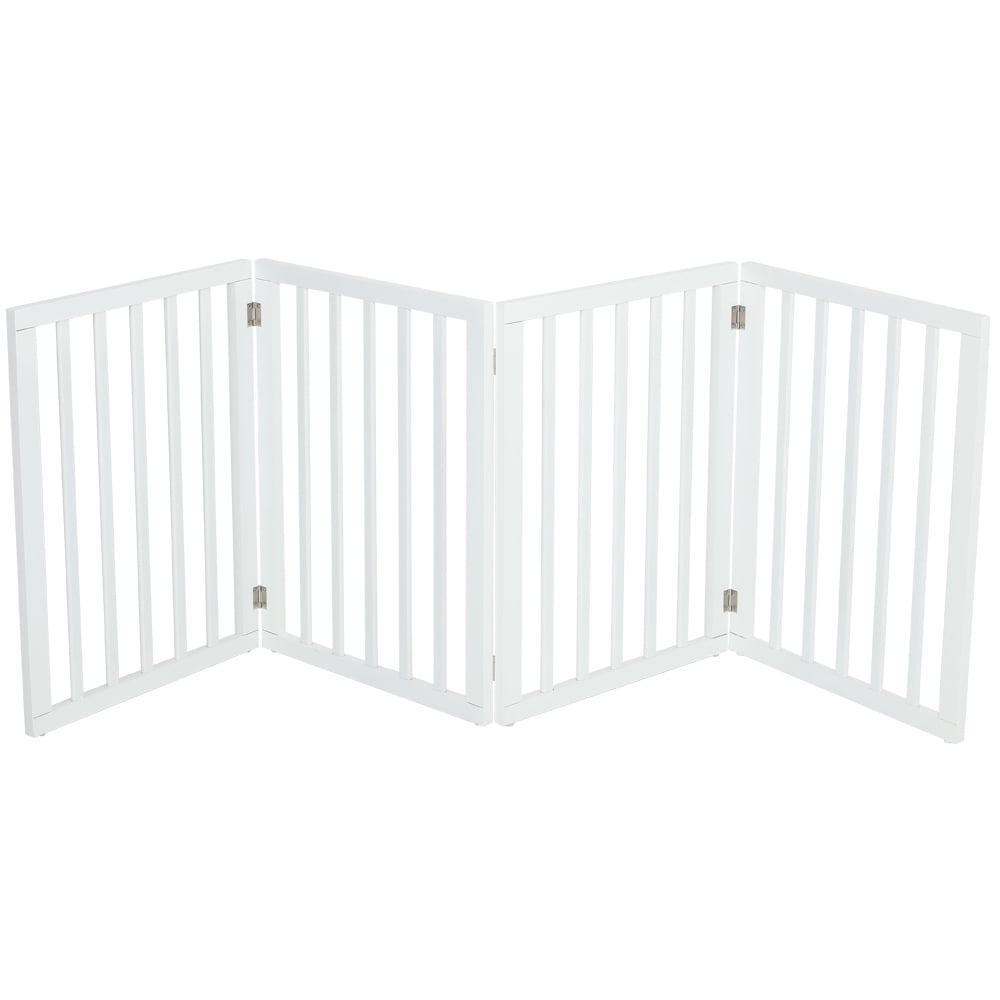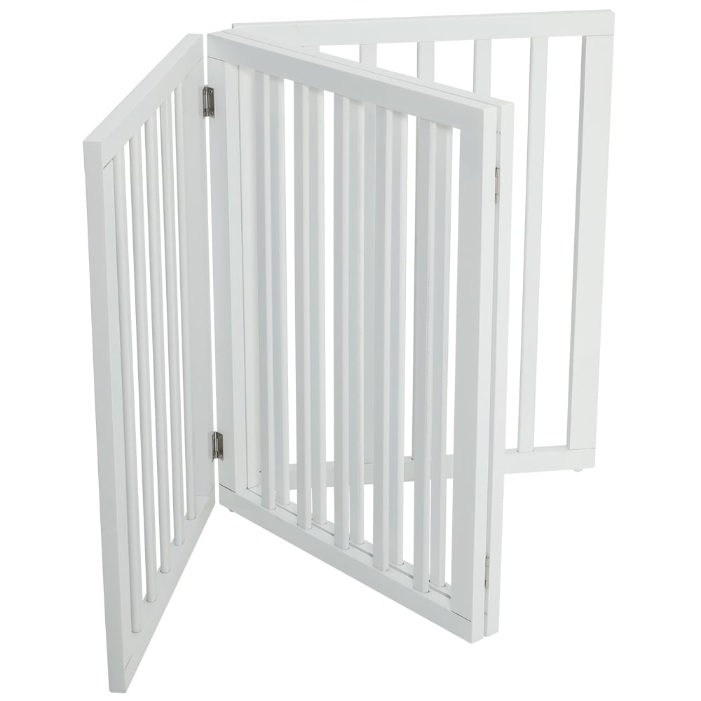 Create a dedicated space for your pets to roam and play with the Living and Home White 4 Panel Wooden Foldable Pet Safety Gate. The tall gates offer a sturdy barrier suitable for larger animals. Constructed with four separate panels connected by robust hinges, the gate can be easily folded out into a Z-shaped configuration. When not in use, the gate can be conveniently folded up and stand on its own, making it versatile for use in entryways, halls, bedrooms, and staircases. Crafted from durable wood, it adds a touch of warmth to your living spaces while offering flexibility and convenience.