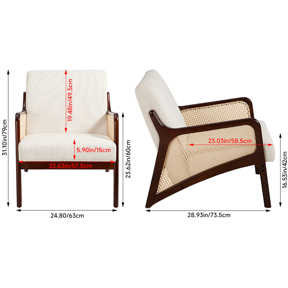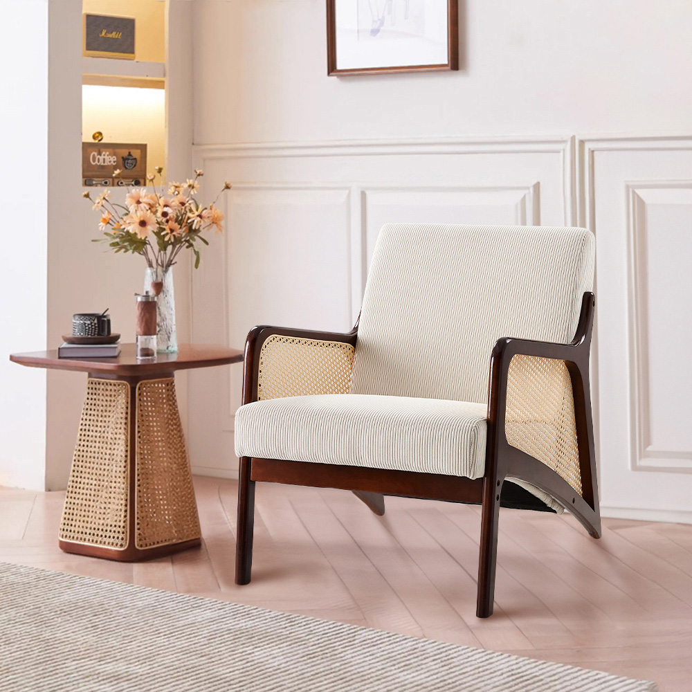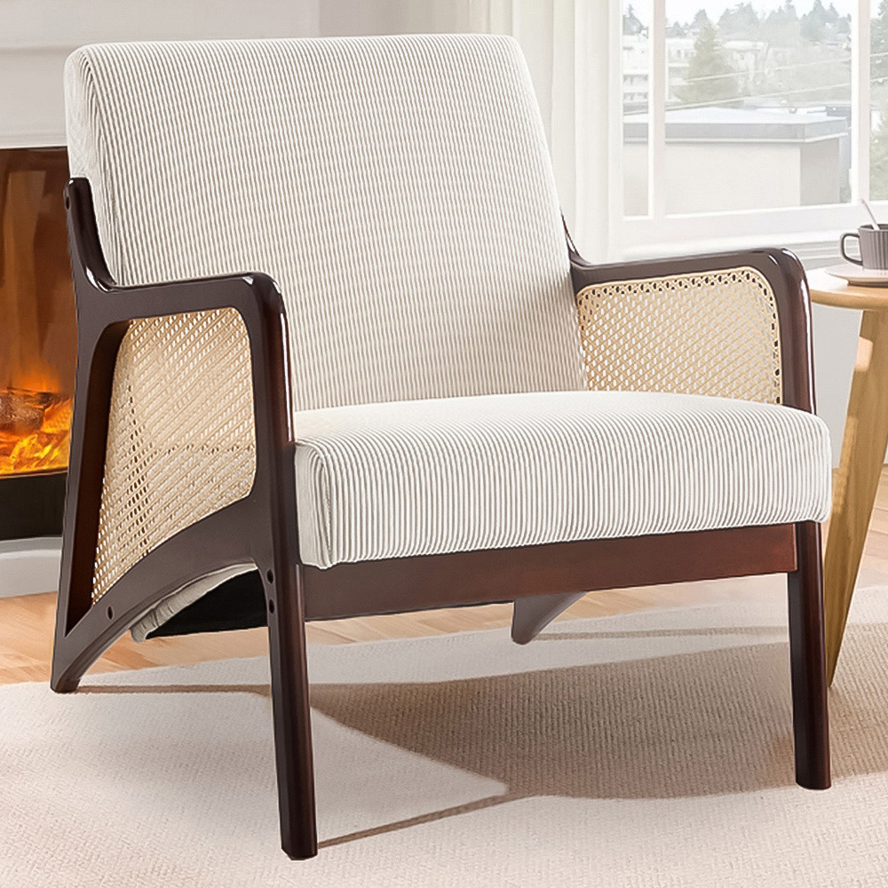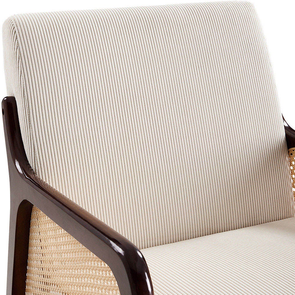 This armchair is the perfect companion for your me time, whether you're reading a book or playing video games. Upholstered in luxurious corduroy fabric, it offers both a classy appearance and lavish comfort. The sturdy rubberwood legs ensure lasting support, while the rattan detailing on the armrests adds a unique and stylish touch. Ideal for unwinding after a long day, this armchair brings both comfort and elegance to any living space.