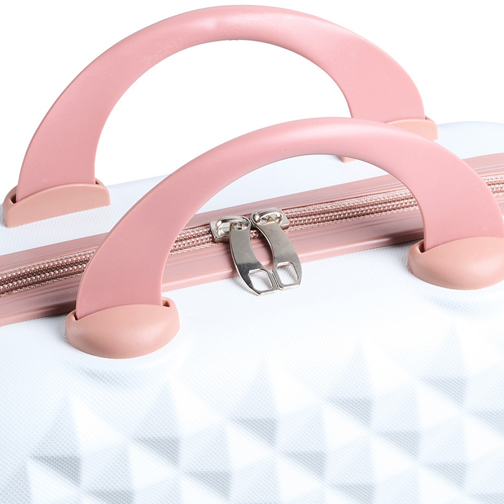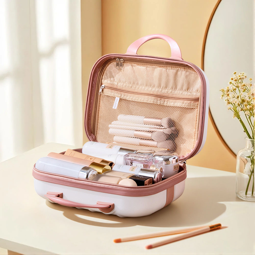 Brighten up your travels with a compact hard shell cosmetic travel case that combines playful white and pink colours with a sturdy geometric design, making organisation effortless wherever you go. Enjoy a tough ABS shell that resists scratches, a soft polyester lining that cushions your essentials, and handy compartments for separating makeup, brushes, and toiletries. Sturdy handles and an elastic strap mean you'll move easily from daily commutes to weekends away, while the reliable zip keeps everything secure and ready for use.