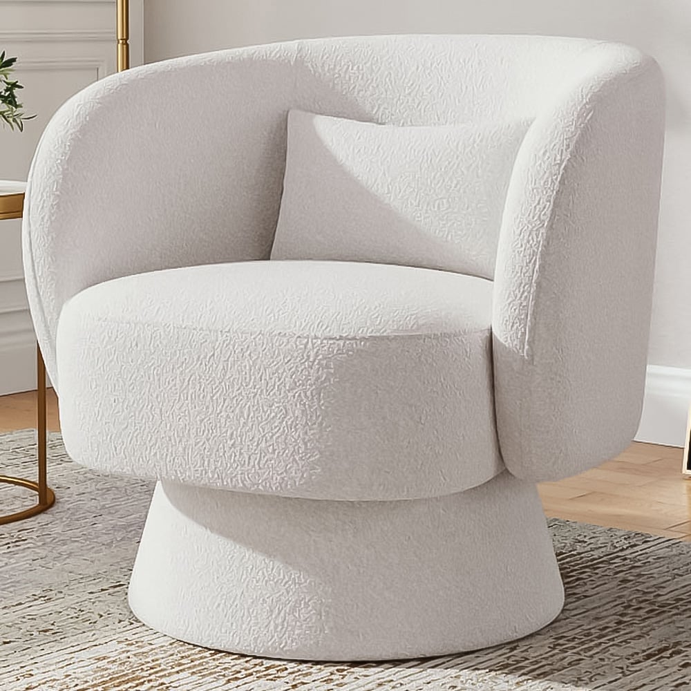 Indulge in serene comfort with this modern swivel accent chair, designed to bring both elegance and ease to your space. The soft off-white tone introduces a calming, natural touch, perfect for a cozy living room or quiet study corner. Its streamlined barrel silhouette, with a smoothly integrated backrest and arms, offers a refined look from every angle. The generously padded seat and included lumbar pillow cradle your body with support, while the swivel base adds effortless flexibility—ideal for reading, relaxing, or simply unwinding in style.