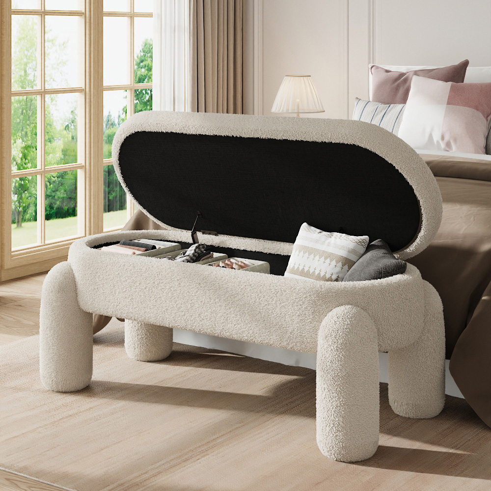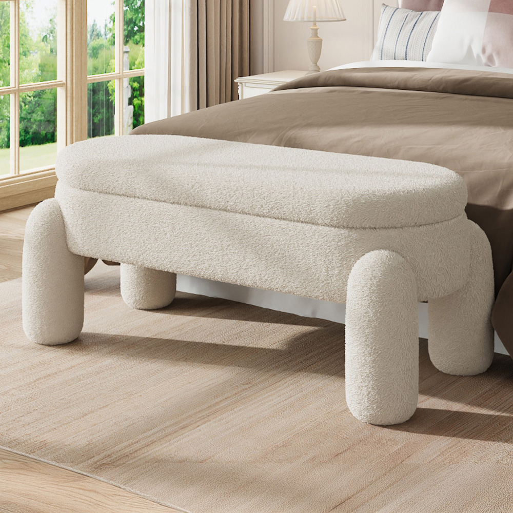 Invite cosiness and clever organisation into your home with a white upholstered bench that features plush teddy fleece, soft sponge padding and a sturdy wooden frame, making it a practical seat and a spacious storage solution for blankets, towels or essentials in any room; its hinged lid stays open for easy access and plastic foot pads help protect your floors, so you’ll find it fits effortlessly with your décor, whether in the bedroom, living room or hallway.