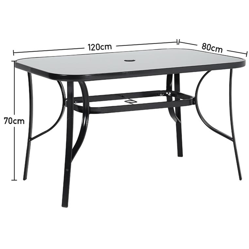 Upgrade your time outdoors with this Living and Home Wicker 4 Seater Black Dining Set. This set features a table with a 5mm tempered glass top and a durable metal frame, ensuring stability and safety. The tabletop has an umbrella hole for use on sunny and rainy days. The stackable chairs are easy to store and move, with breathable surface to offer a comfortable sitting experience. Ideal for gardens, patios, balconies and pool areas. Note: Two packages may arrive at different times.
