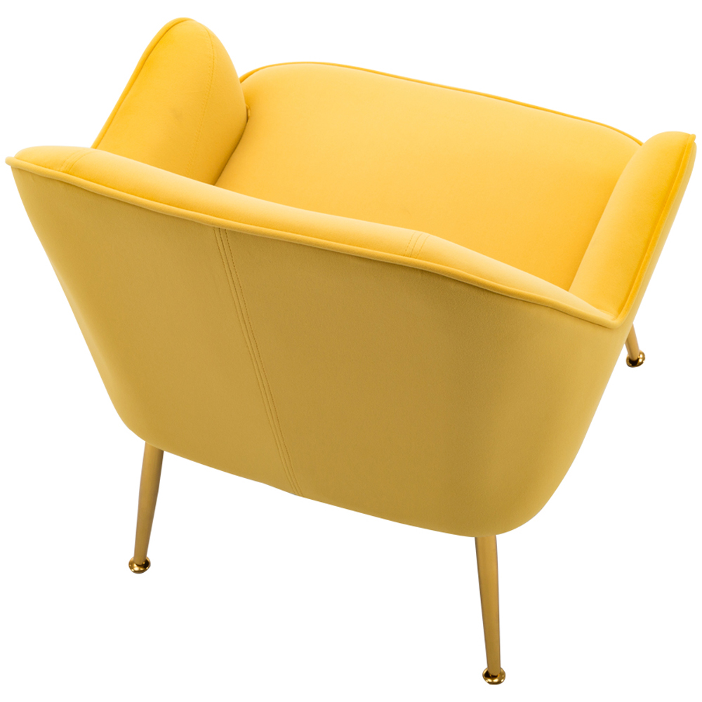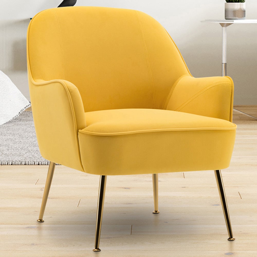 Redefine your living space with the Living and Home Yellow and Gold Armchair. This stylish single-person lounge sofa is crafted from durable and comfortable non-down velvet sponge material, ensuring both longevity and comfort. The simple and generous design style adds a touch of elegance to any room. Its gold-plated legs provide stability, while scratch-resistant plastic feet prevent damage to the floor. Whether placed in the living room, bedroom, lounge, or office, this sofa offers an attractive visual appeal and a comfortable seating experience. Assembling is required.