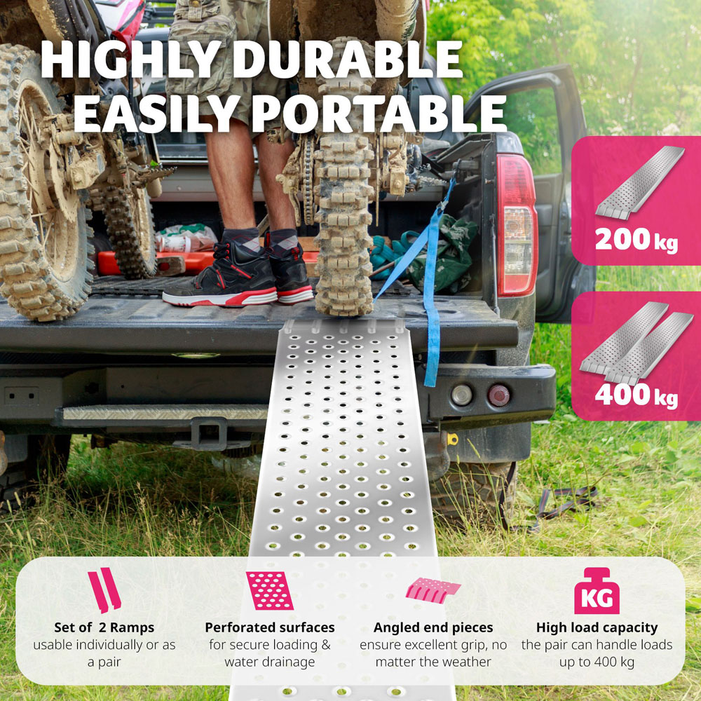 The pair of loading ramps Sven by tectake are a practical aid to make your daily life easier and to protect your back. Each ramp is both perforated and bevelled, to minimise water retention and maximise grip, putting your safety first. The trailer ramps are made of galvanised steel, which protects them from corrosion and makes them even more resistant. Each ramp has an enormous load capacity, offering you numerous possibilities for use, such as loading furniture, motorcycles, lawnmowers, wheelchairs, and much more.