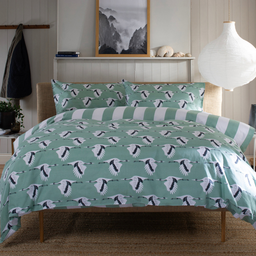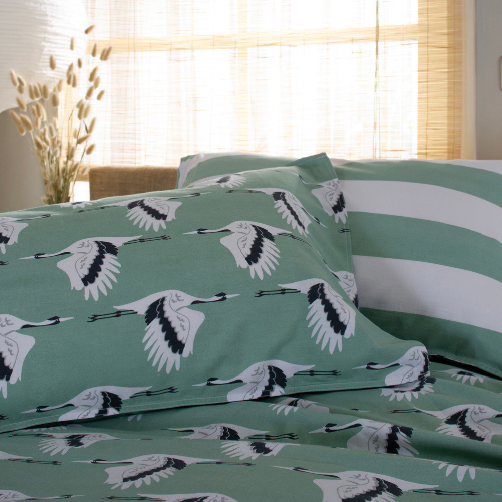 Transform your bedroom with our Crane Bedding Collection. This striking 100% cotton bedding set features graceful white cranes in mid-flight against a calming sage green background, complemented by coordinating striped pillowcases.