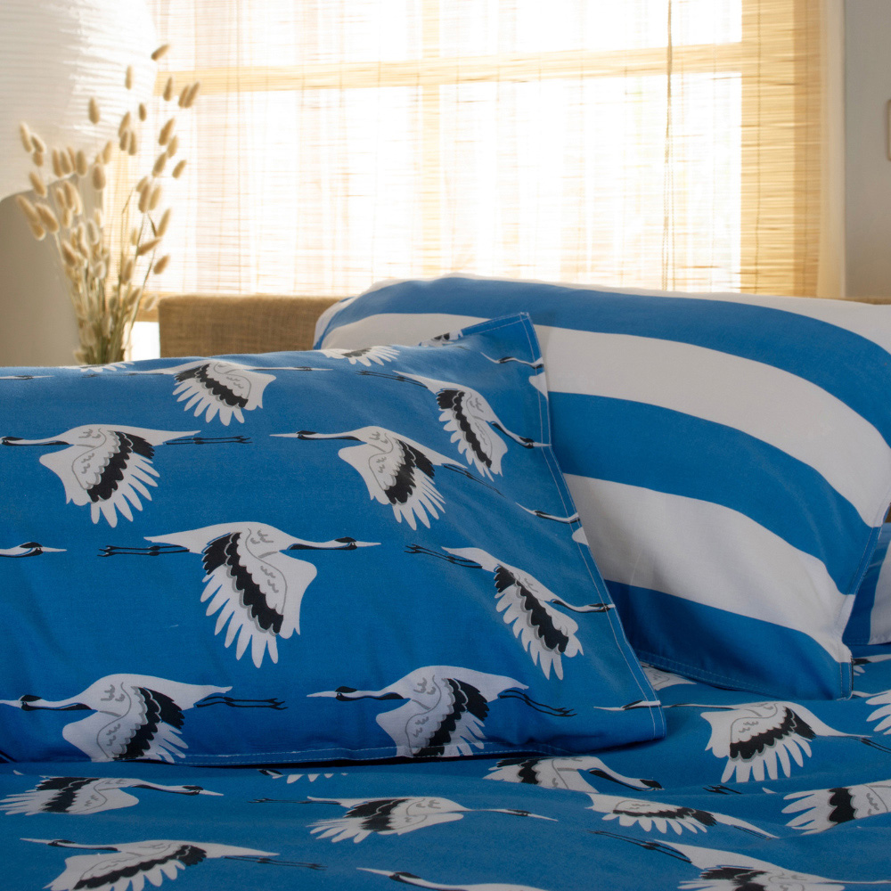 Transform your bedroom with our Crane Bedding Collection. This striking 100% cotton bedding set features graceful white cranes in mid-flight against a calming sage Blue background, complemented by coordinating striped pillowcases.