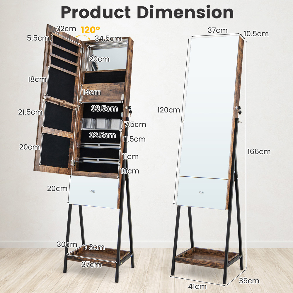Unlock the potential of your jewellery and makeup collection with the Costway Rustic Brown LED Full Length Mirror Jewellery Armoire. This elegant piece enhances room aesthetics with its unique segmented mirror design and offers a comprehensive solution to organize and secure your jewellery and cosmetics. The internal makeup mirror and adjustable three-colour LED lights provide perfect lighting to match your mood or outfit, while the lockable design keeps your valuables safe. With ample storage including hooks, slots, and shelves, this armoire ensures everything from necklaces to earrings and rings are neatly stored and easy to access.