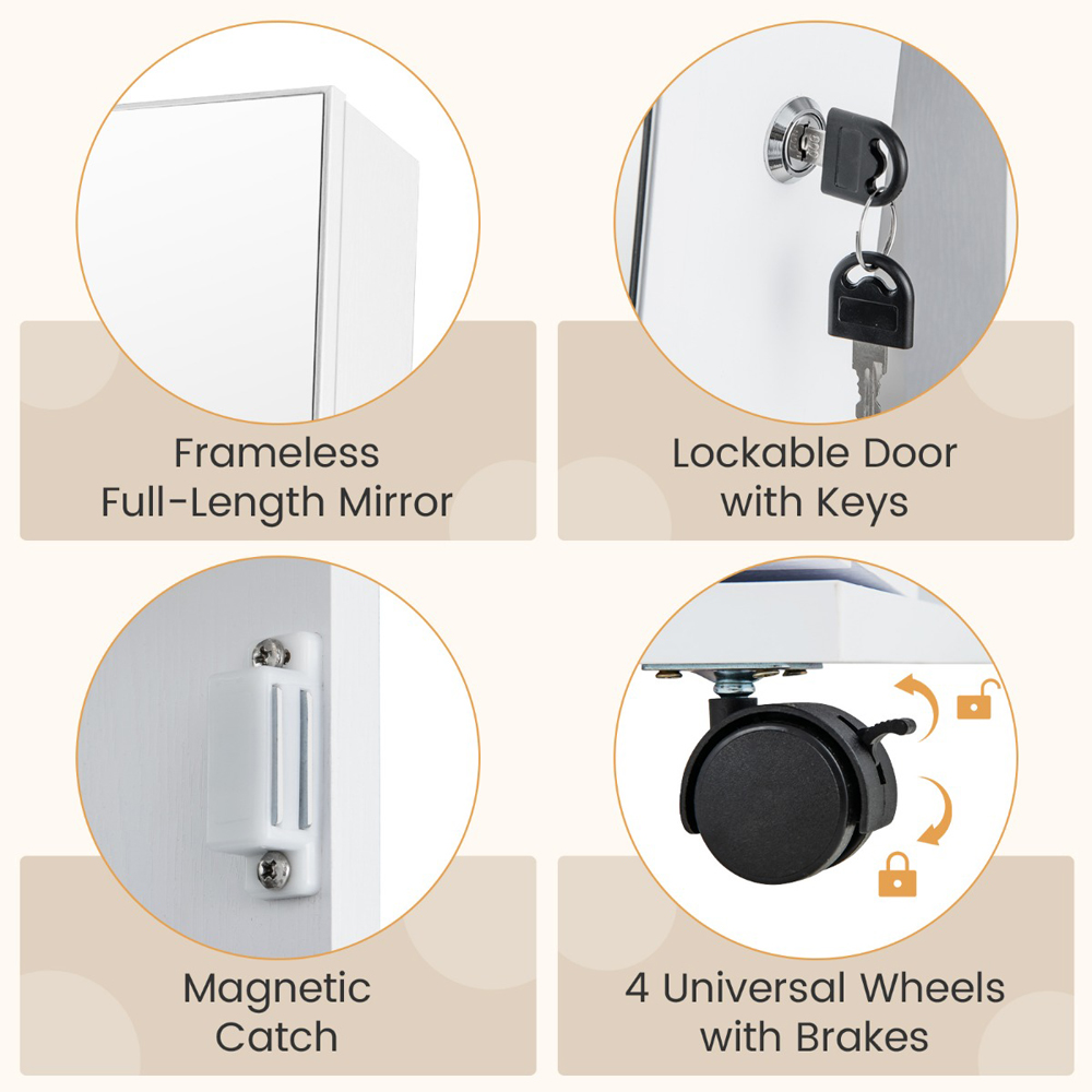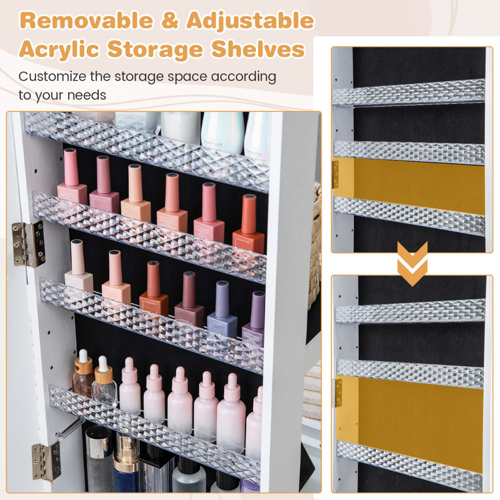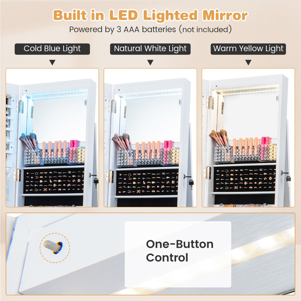 Elevate your morning routine with the Costway White LED Full Length Mirror Jewellery Armoire, a perfect blend of functionality and elegance. This piece not only keeps your jewellery collection neatly organized and accessible but also features a built-in makeup mirror with 3-colour LED lights, enhancing your daily preparation. Its full-length mirror not only serves a practical purpose but also adds a decorative touch to your space. Crafted from high-quality materials, this armoire is designed to provide secure and ample storage with its multiple compartments, hooks, and shelves. Whether in a small apartment or a spacious home, this jewellery cabinet's space-saving design ensures it fits perfectly while adding a touch of sophistication.