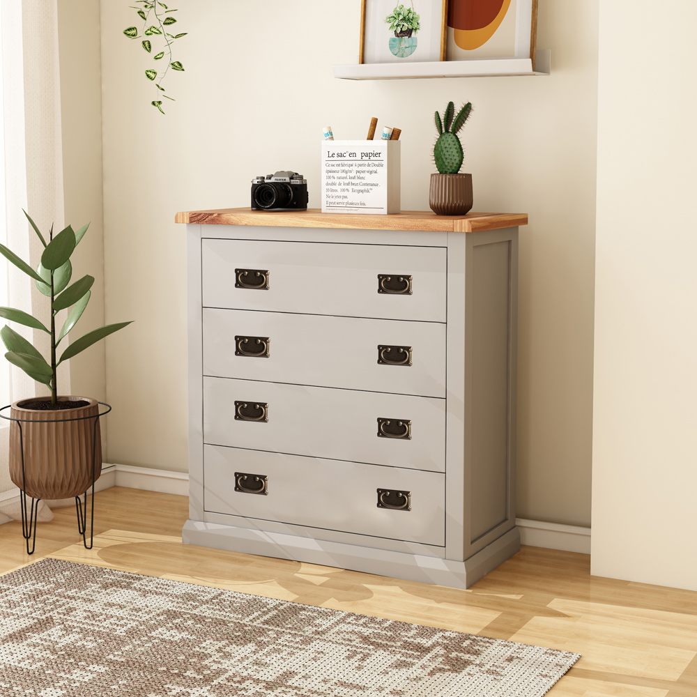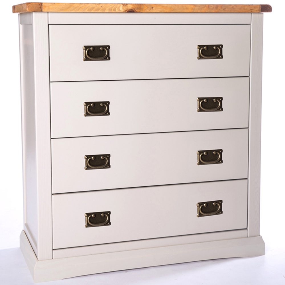 Make your home decor more impressive with the Loreo 4 Drawer Light Grey Chest of Drawers with Brass Drop Handles. This storage chest has a waxed pine wood top for keeping a clock or a decorative item. It features four drawers with brass drop handles and ample storage space for keeping your essentials. The body is carefully hand-finished with an eco-friendly water-base lacquer. It is crafted using a combination of solid pine wood and veneers with a sturdy base for stability and support. This storage chest has a simple construction for easy home assembly. It is suitable for all types of traditional and contemporary interior spaces.