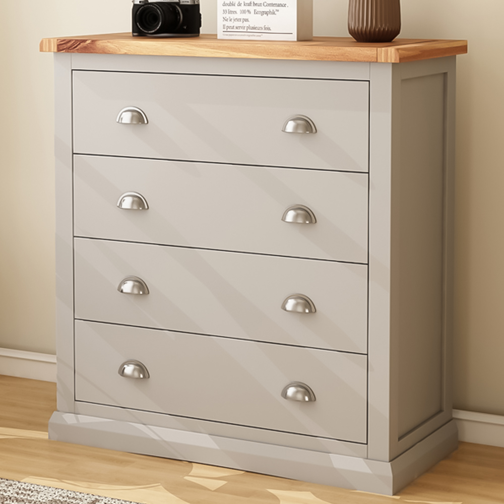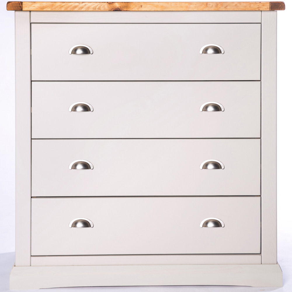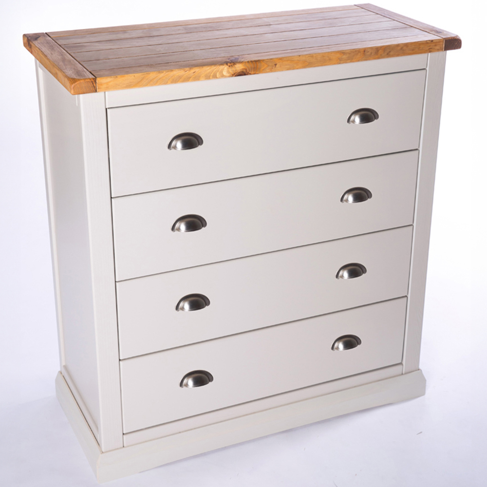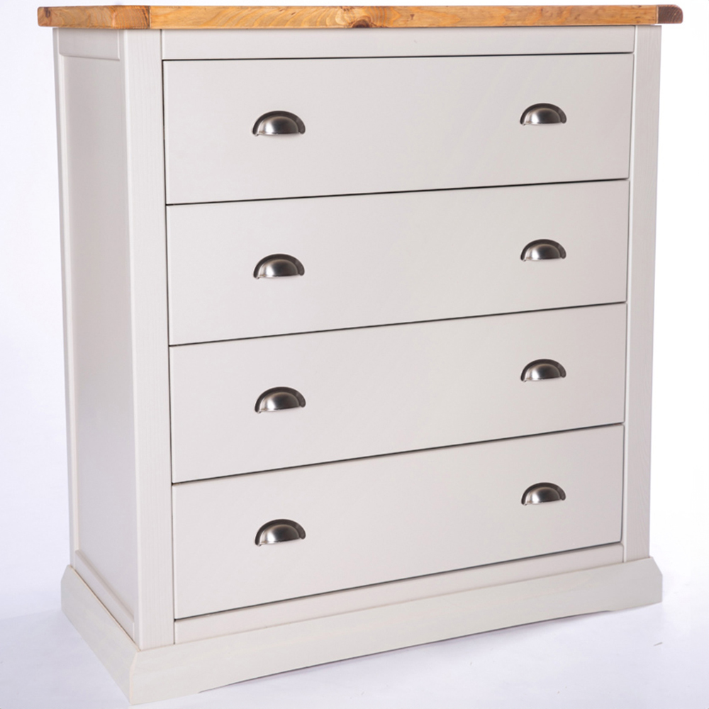 Make your home decor more impressive with the Loreo 4 Drawer Light Grey Chest of Drawers with Chrome Cup Handles. This storage chest has a waxed pine wood top for keeping a clock or a decorative item. It features four drawers with chrome cup handles and ample storage space for keeping your essentials. The body is carefully hand-finished with an eco-friendly water-base lacquer. It is crafted using a combination of solid pine wood and veneers with a sturdy base for stability and support. This storage chest has a simple construction for easy home assembly. It is suitable for all types of traditional and contemporary interior spaces.
