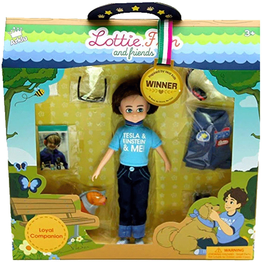 Loyal Companion is a Lottie Boy Doll playset inspired by a little autistic boy who loves everything space-themed. Diversity in dolls is important. In fact, studies show that after playing with kids' toys - like the doll inspired by Hayden - children are more open to forming friendships with kids that have disability and differences. Cookie is Hayden's companion dog and best friend. Cookie goes everywhere with Hayden. Hayden wears a blue t-shirt and wears headphones to keep out any loud noise.