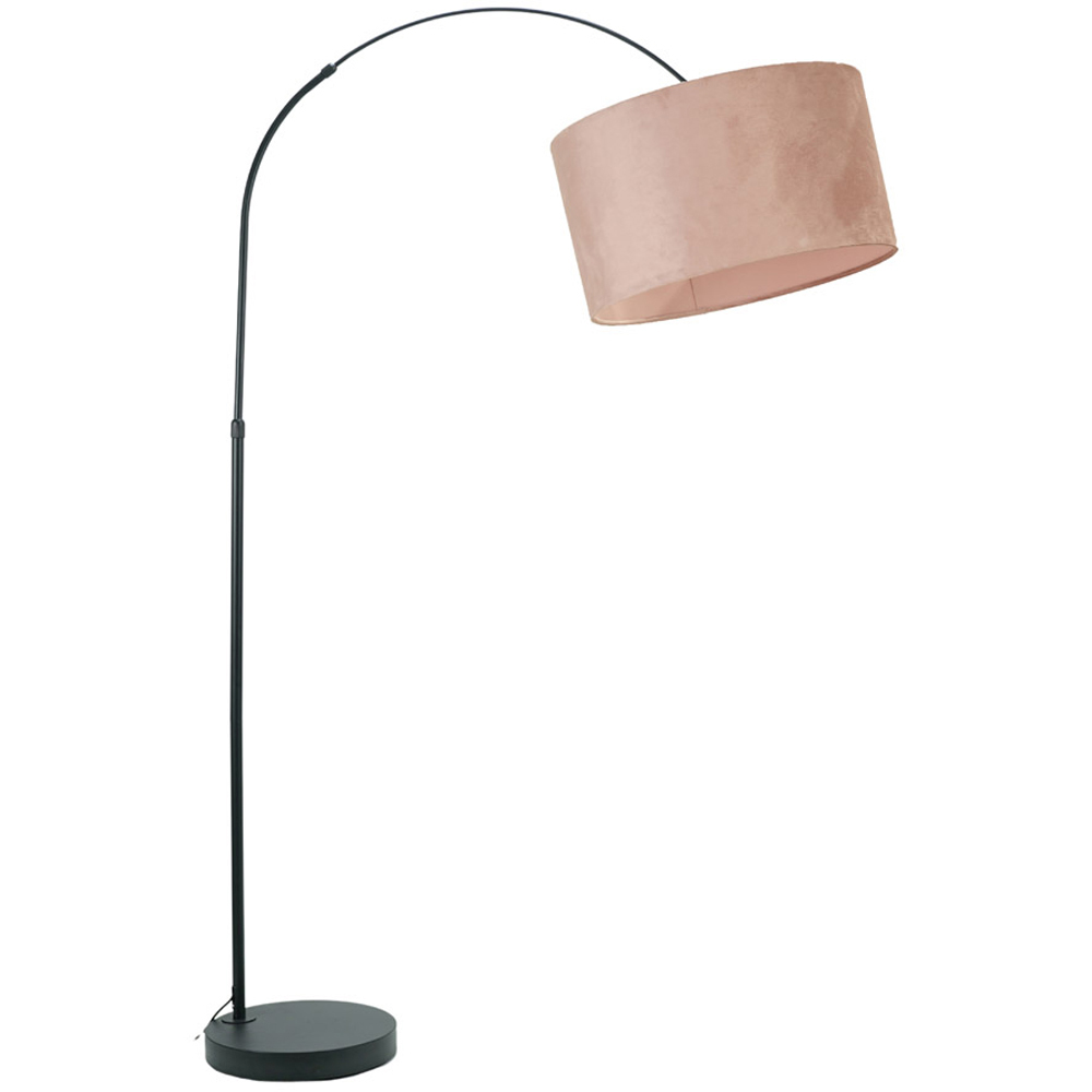 Add a vintage yet modern finish to your home decor with the ValueLights Louis Blush Pink Velvet Drum Shade Black Curved LED Floor Lamp. This arch floor lamp adds a classic and sophisticated look to your space. It is ideal for reading lights, slotting beside or behind sofas so the light hangs overhead. The lamp features a slim black metal design crowned with a blush pink velvet drum shade. It measures H180 x W45 x D105cm.