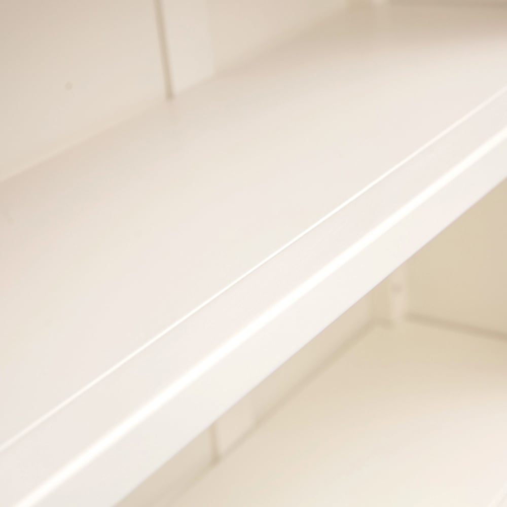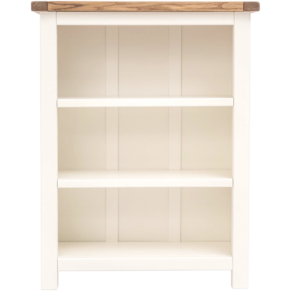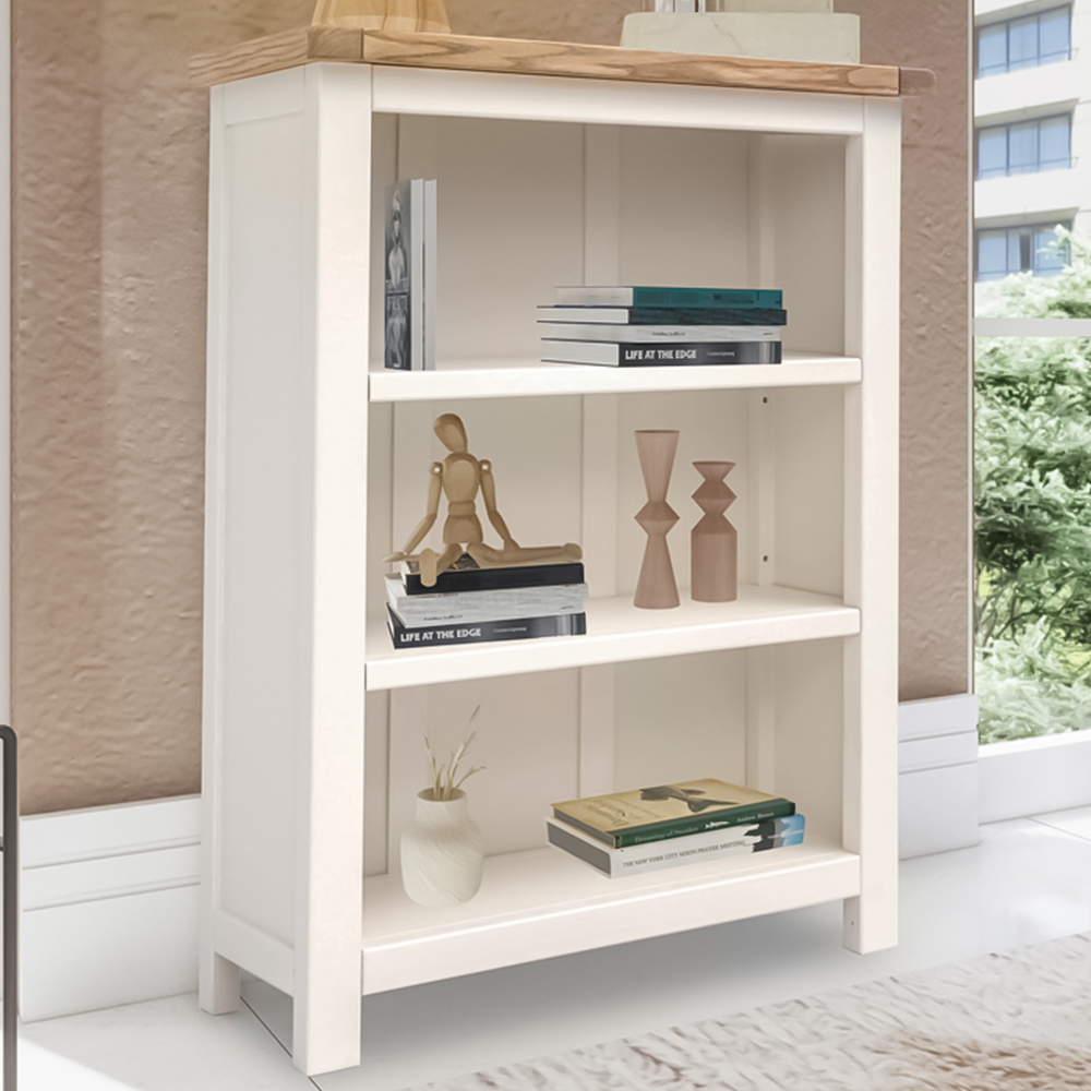 Elevate the style of your living space with the simple but pleasing design of the Lovere 3 Shelf Off White Bookcase from Cabinet Bits. Crafted by skilled craftsmen to the highest standards using responsibly sourced wood and veneers, so rest assured it'll last season after season. Additionally, its tops are made using a combination of hardwood and ash veneer and are carefully hand-waxed, giving it a great look. The body is finished with high-quality, eco-friendly, water-based paint in an off-white colour. This stylish low bookcase is ideal for storing and organising your collection of books or perhaps CDs or DVDs over three shelves. The two central shelves are adjustable to tailor the space to suit your requirements. The top is ideal for displaying a favourite photograph or a houseplant. The two drawers below are deeper and perfect for storing underwear or accessories. These attributes, combined with a simple construction for easy assembly, make it a great product for any household. Dimensions: 90 x 70 x 25cm.