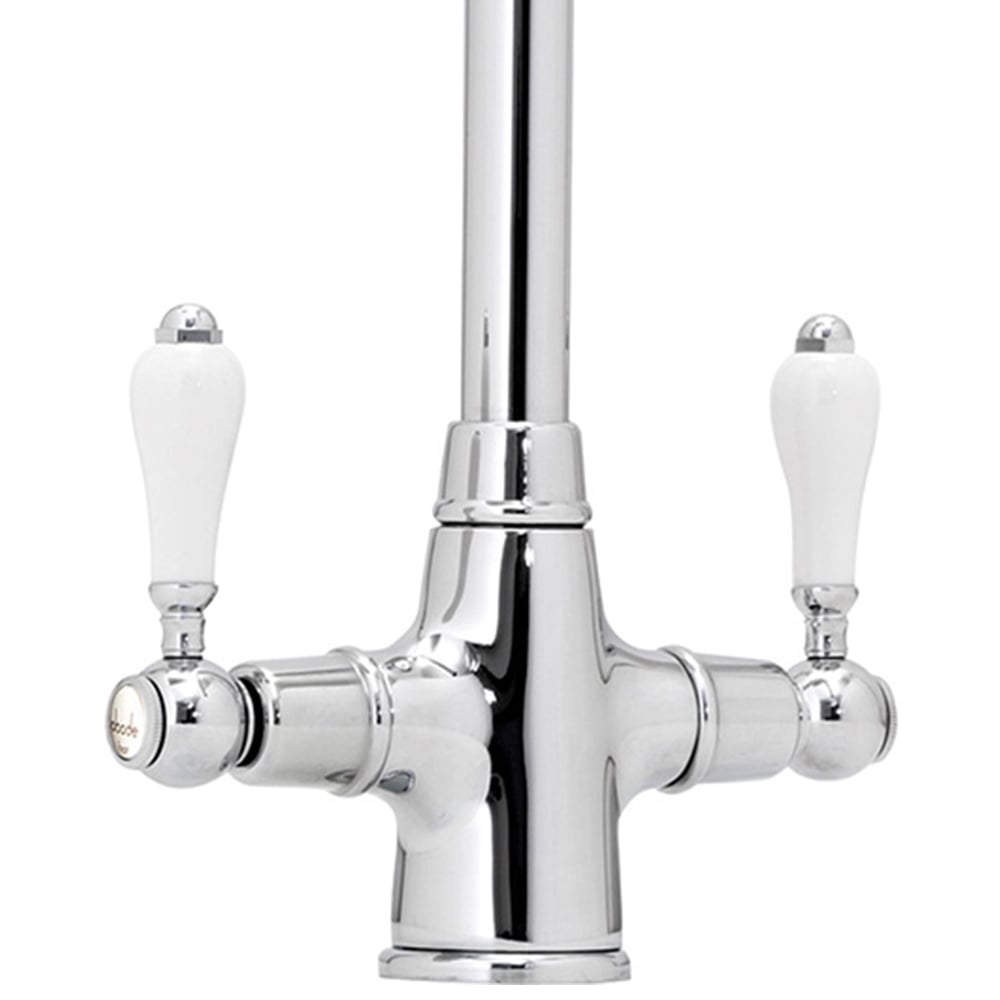 Make a stylish addition to your kitchen with this Ludlow Chrome Dual Lever Mono Kitchen Tap. Victorian-inspired, the tap is heavily influenced by a classic era in British Design, combining it with modern-day engineering technology to craft a true modern-day classic. The elegant swan neck, effortlessly controlled, white lever handles, and glistening chrome finish are perfect for adding a touch of classic charm to your kitchen. This modern marvel isn't just functional; it's a stunning design statement to complement any kitchen. So why wait? Elevate your kitchen today.