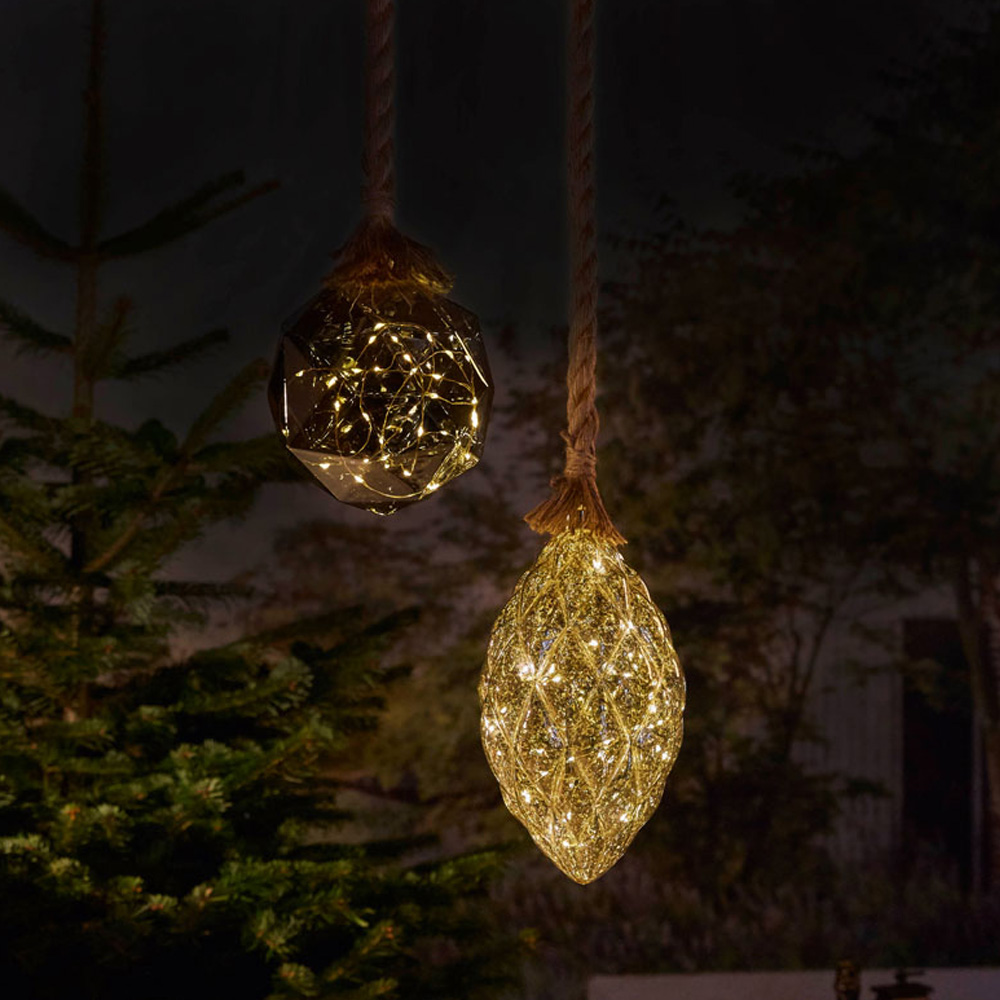 Enhance the ambience of your space and give a touch of mood lighting with this Brown Hemp Rope Light from Luxform. This very atmospheric lamp in the shape of a pine cone hanging from the end of a rope has 40 micro-LEDs that provide beautiful light with the help of a battery box. Ideal for decorative purposes, the rope can easily be placed around the branch of a tree or hung in front of a window. Because the battery holder has an IP value of 44, the lamp can be used both indoors and outdoors. The real glass pine cone is slightly speckled which means it will be beautifully illuminated. The lamp has a 24-hour timer. This means that the lamp stays on for six hours after switching on and switches off automatically for 18 hours. After these 18 hours, the lamp automatically switches on again and stays on for six hours. It is also possible to run the lamp around the clock. All you need to purchase separately is three AA 1.5 Alkaline or 1.2 V NiMh batteries(not supplied). Each battery lamp works independently of other lamps and does not require a cable, sunlight or transformer. Due to the battery operation, the lamp is also suitable for balconies and shady and dark places without a power connection.
