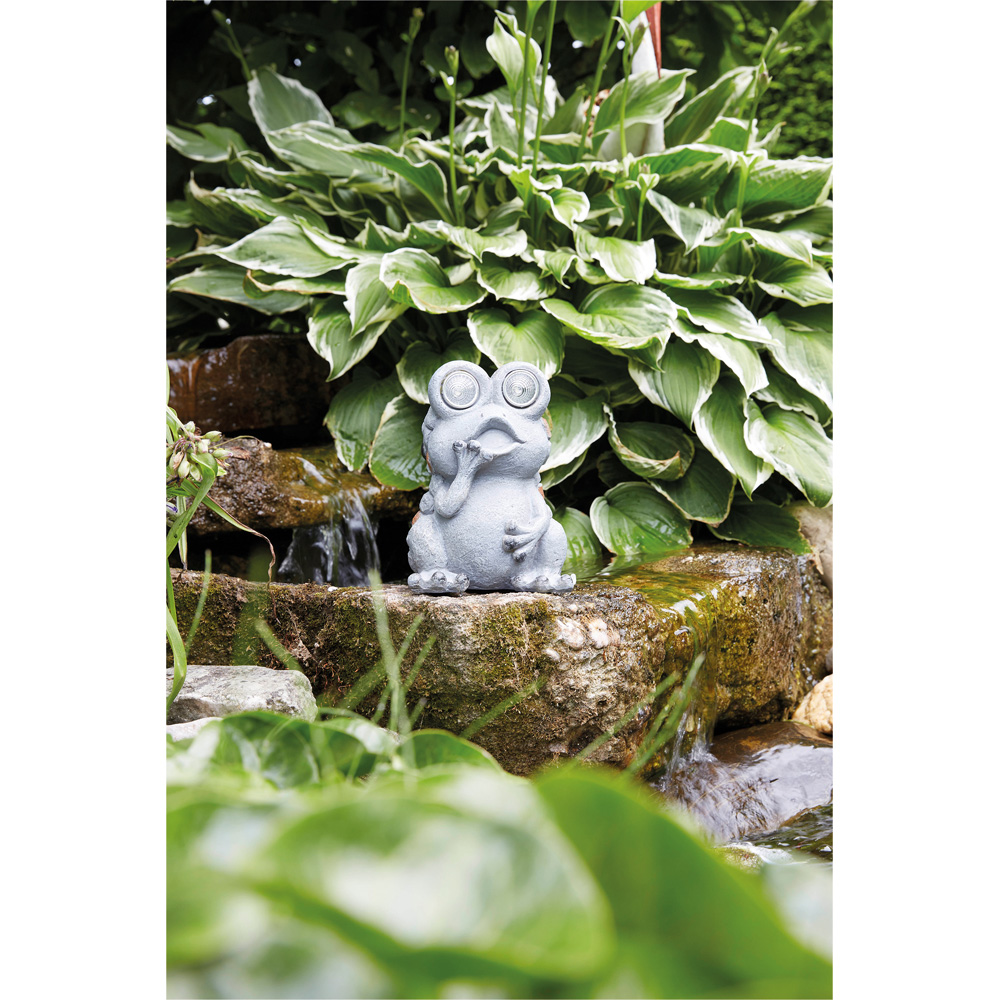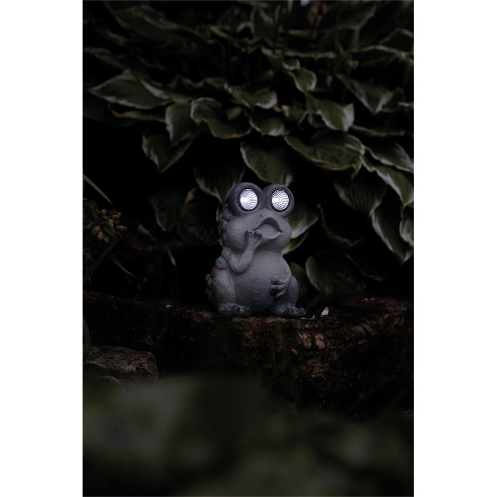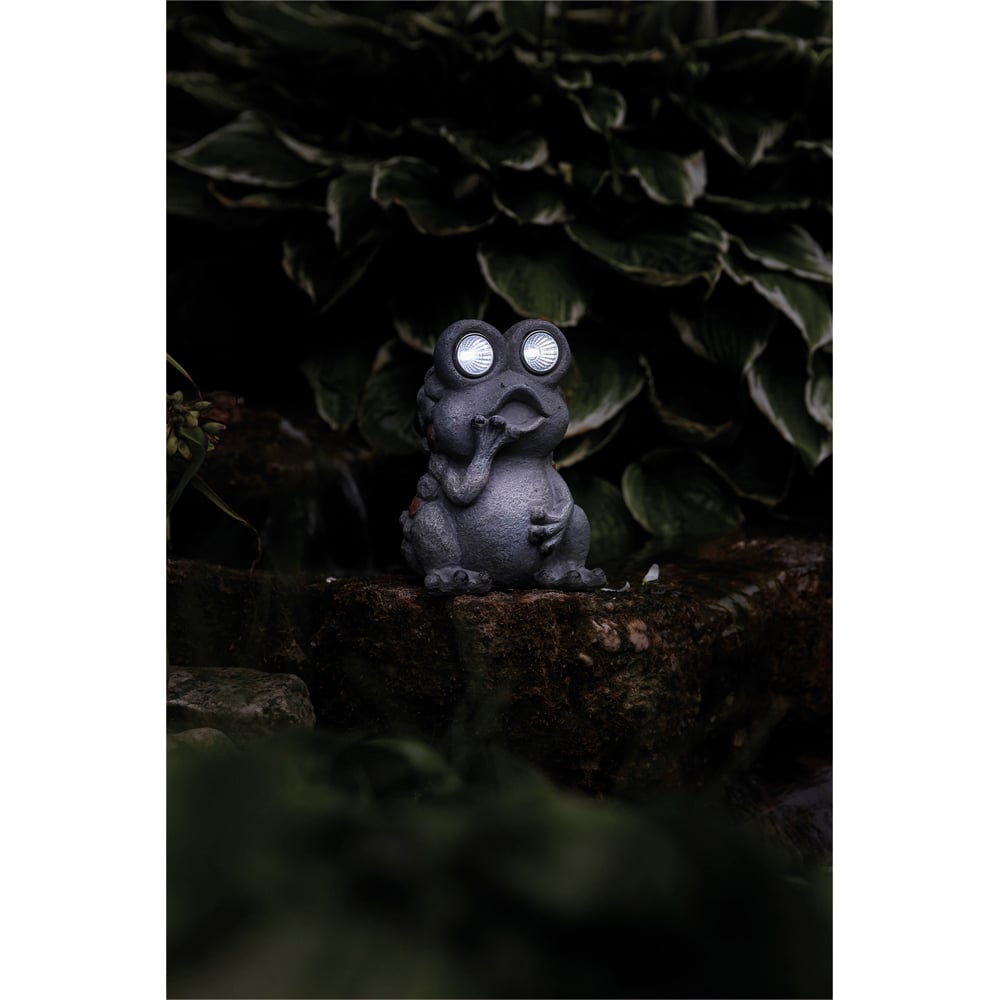 Enhance the beauty of your garden, even in secluded locations, with the Luxform Solar Powered LED Stone Frog Light. This exquisite decorative frog can be placed anywhere under the sun, without the need for any wires, as it operates solely on solar power. It is an energy-efficient solution that adds a touch of elegance to garden lawns, patios, borders, paths, and porches, providing a gentle ambient light that illuminates its surroundings. The integrated solar panel harnesses the sun's energy during daylight hours, recharging the battery for up to six hours of light. As dusk approaches, the light automatically turns on, and it switches off again at dawn. This light is ideal for remote areas, offering sufficient illumination to mark entrances and accentuate walkways and steps. Crafted from Polystone, a blend of natural stone and resin, this light is resistant to weather conditions and algae growth. It is also IP44 rated, ensuring durability and protection against water splashes. Additionally, it comes with 1 x Atmospheric Softone LED, providing a soft and inviting glow.