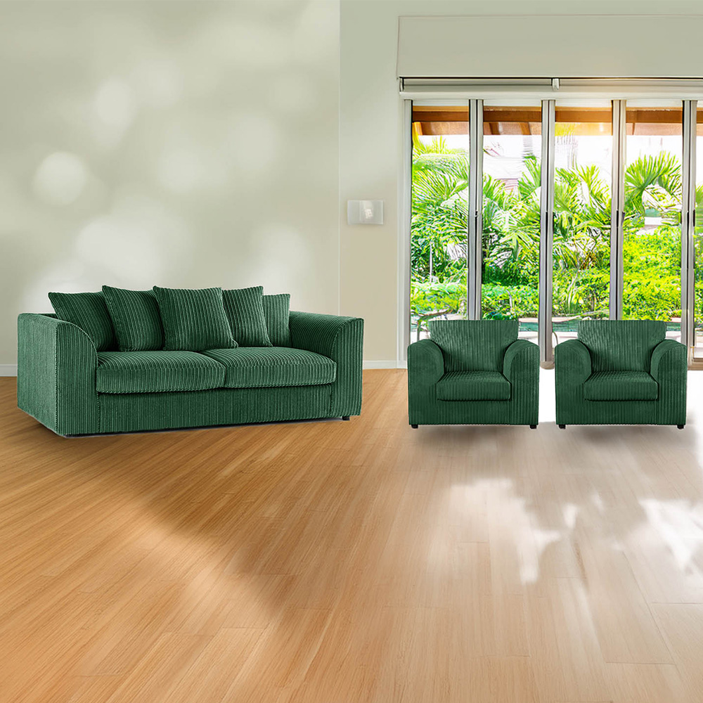 The Scatter Back three-piece sofa suite is made up of three-seater sofa and two armchairs. All feature a soft jumbo cord fabric in a stylish colour. The fabric is comfortable and easy to maintain, making it a great choice for those looking for a practical yet cosy seating option. The cord texture adds a touch of texture and interest to the clean lines of the design, making it a versatile option to suit a variety of home decor styles. With a three-seater sofa and two armchairs, this suite is perfect for living rooms or as a family seating option. Overall, the sofa suite is a stylish and practical choice for those in search of a comfortable and modern sofa set.