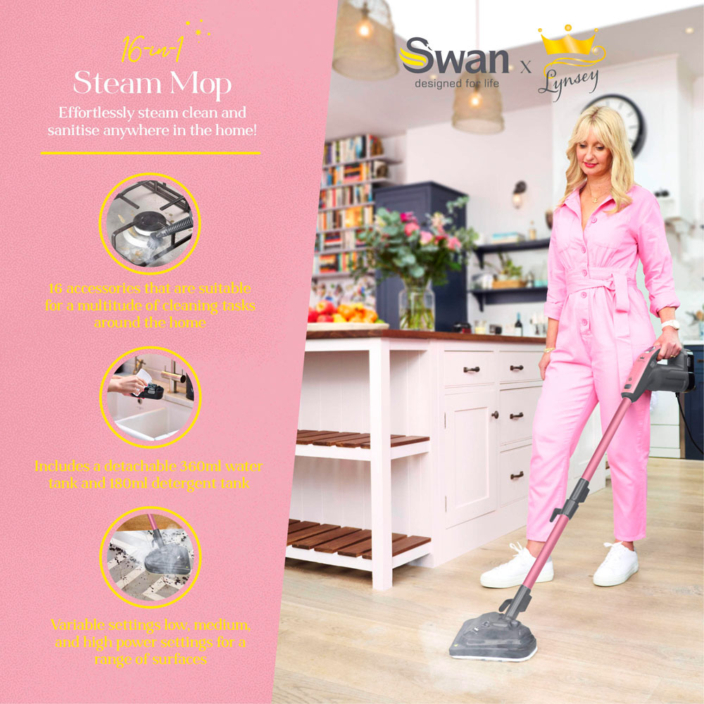 The Swan SC30131QOC steam mop has TV's Queen of Clean crowning stamp of approval. It features variable steam settings and 16 accessories to clean upholstery, windows carpets, wood floors and more, killing 99.9% of bacteria, germs, and viruses. The detachable handheld mode is perfect for steaming curtains, tiles and bathrooms. It's the perfect cleaning companion.