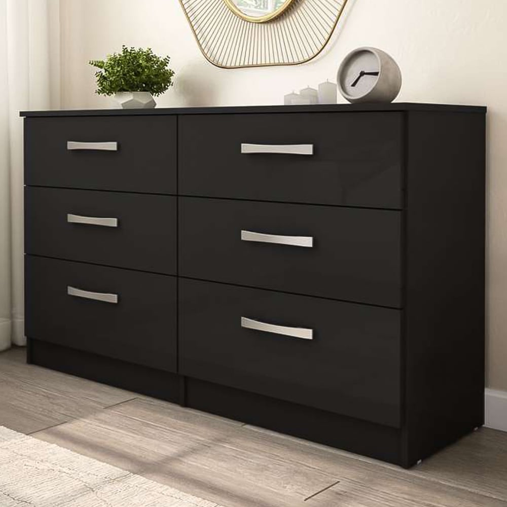 Add a practical option to your living space with this Lynx Chest of Drawers. This black-coloured chest has a modern and sleek design complemented by a high-gloss finish with bold silver detailing to make any space feel contemporary. Constructed from MDP (multiple-density particleboard), the chest features six drawers with silver handles, making the chest an ideal choice for storing away clothes or other essentials. The top panel of this chest can support up to eight kg, and each drawer can support up to five kilograms. With its storage space and sleek, modern design, this chest can change the look of your bedroom decor.