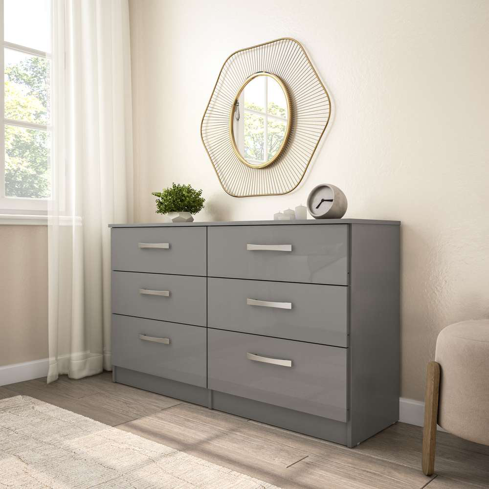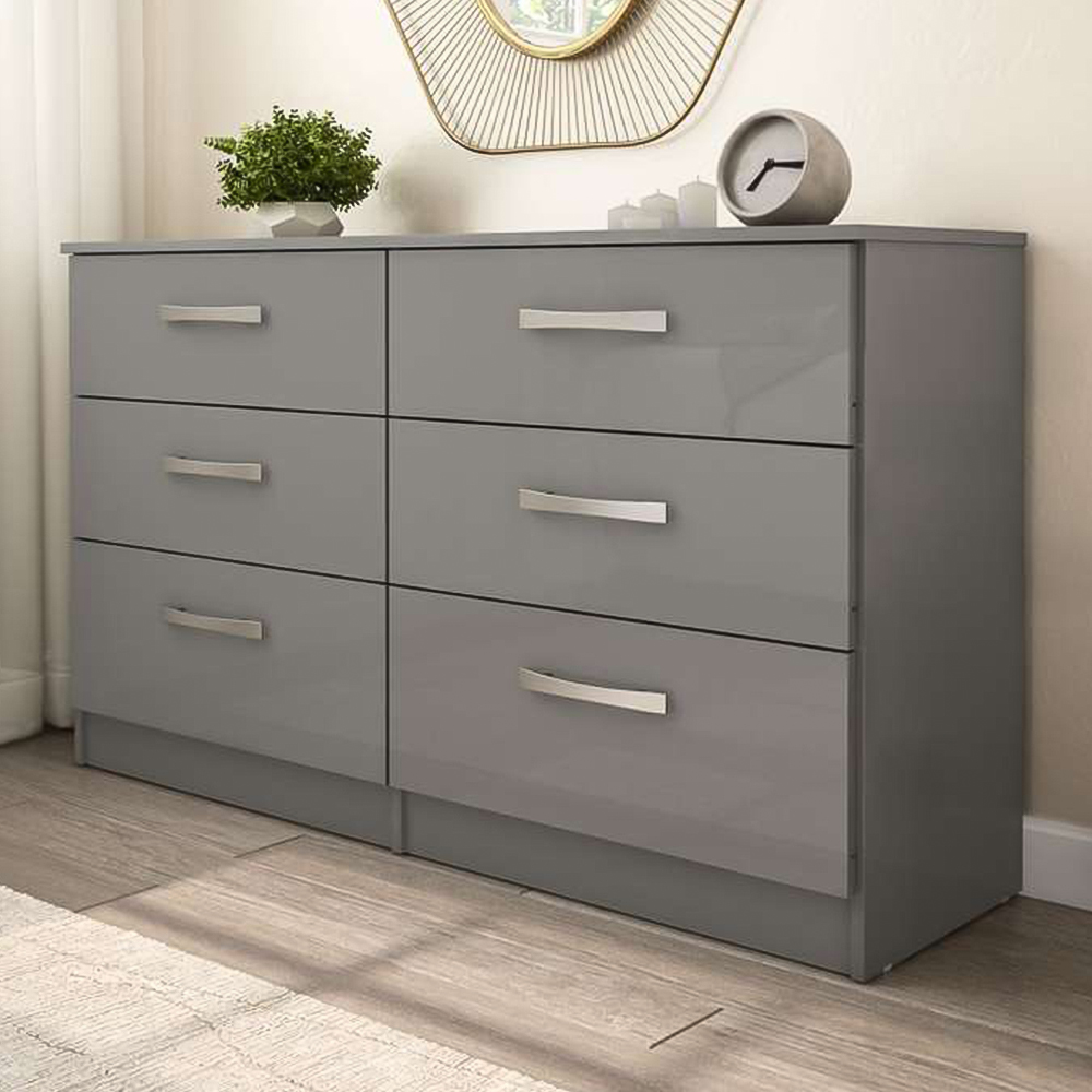 Add a practical option to your living space with this Lynx Chest of Drawers. This grey-coloured chest has a modern and sleek design complemented by a high-gloss finish with bold silver detailing to make any space feel contemporary. Constructed from MDP (multiple-density particleboard), the chest features six drawers with silver handles, making the chest an ideal choice for storing away clothes or other essentials. The top panel of this chest can support up to eight kg, and each drawer can support up to five kilograms. With its storage space and sleek, modern design, this chest can change the look of your bedroom decor.
