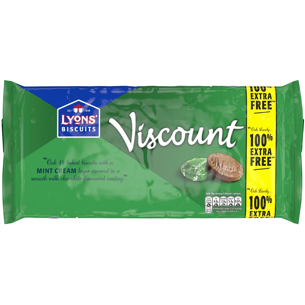 ''Ooh 14 Baked Biscuits With A Mint Cream Layer Covered In A Smooth Milk Chocolate Flavoured Coating.''. No Artificial Colours, Flavours, Sweeteners And Preservatives. Non Gm Ingredients. No Hydrogenated Fats. Suitable For Vegetarians. Lyons'.