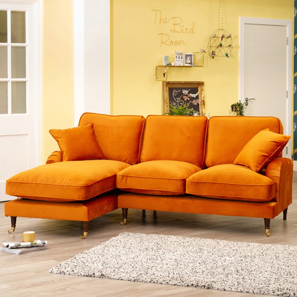 Enhance your living space with this Mackenzie 3 Seater Burnt Orange Velvet Left Hand Corner Sofa. This elegant corner sofa is constructed from a solid and hard wooden frame. With both foam and a spring inside, it offers perfect comfort and incredible support. It is upholstered in soft, plush velvet and has a left-hand-facing chaise. A two-man delivery team will deliver it to your room of choice and assemble it for you. Dimensions – Height: 91cm, Width: 217.5cm, Sofa Depth: 96cm, Chaise Length: 160cm, Seat Height: 48cm, Seat Depth: 63cm.