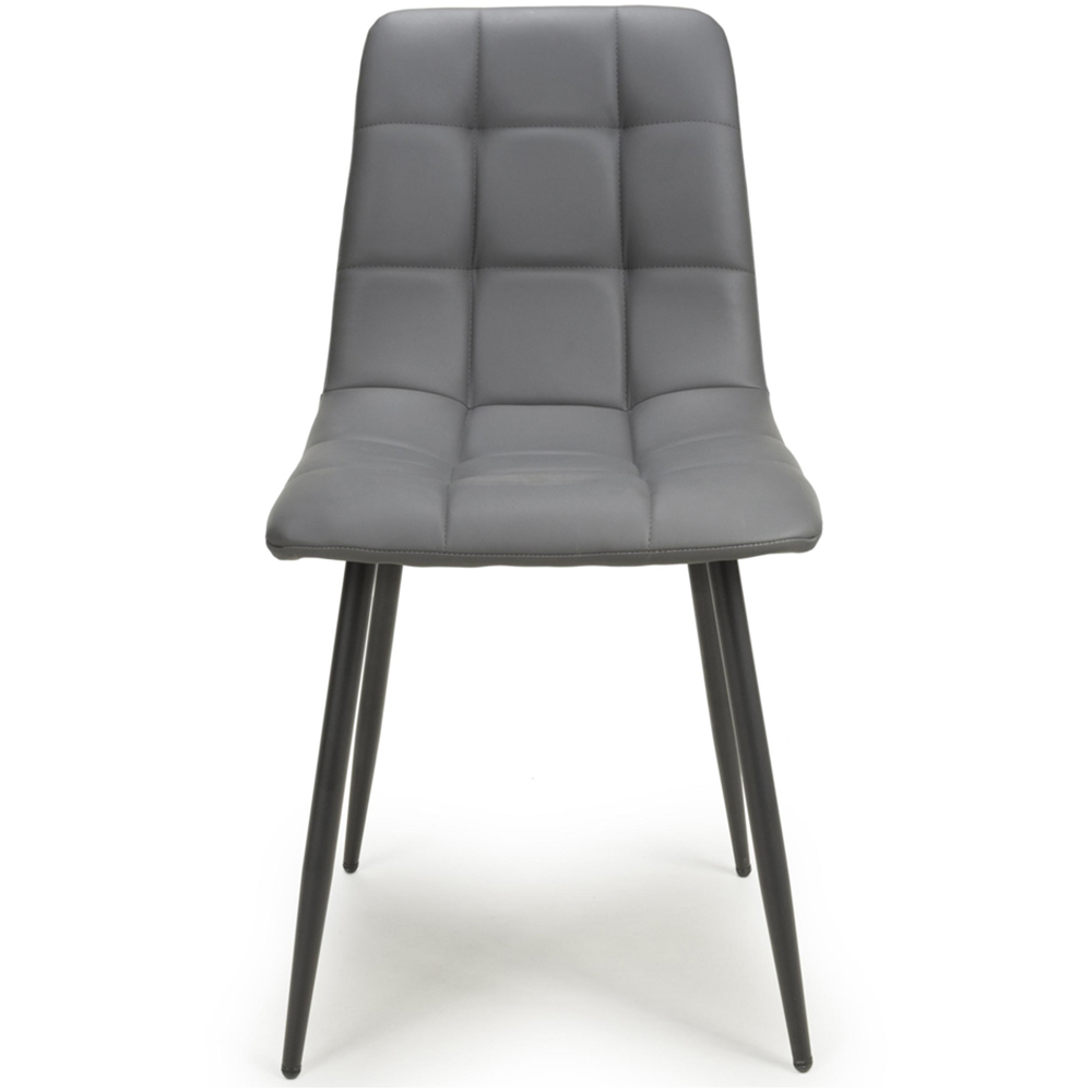 Gently sloped, this Madison Leather Effect Grey Dining Chair is upholstered in leather effect. The comfortably contoured seat and back feature stylish square panelled stitching. Fitted with cross-frame tapered black metal legs. Assembly required.