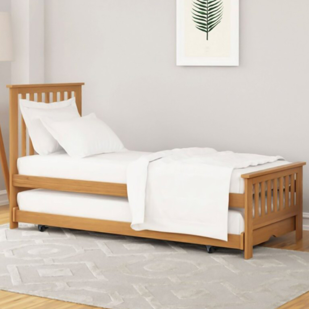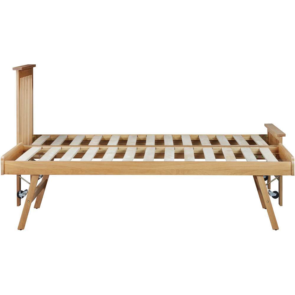 Maximise your space and add comfort with the Maeve Single Natural Oak Guest Bed and Trundle. This beautiful oak guest bed features a convenient trundle bed that neatly tucks away underneath. The slatted base offers both stability and comfort. The trundle comes with foldable legs, allowing it to be raised to the same height as the main bed frame. Its elegant traditional shaker-style appearance adds a touch of timeless charm to any space.