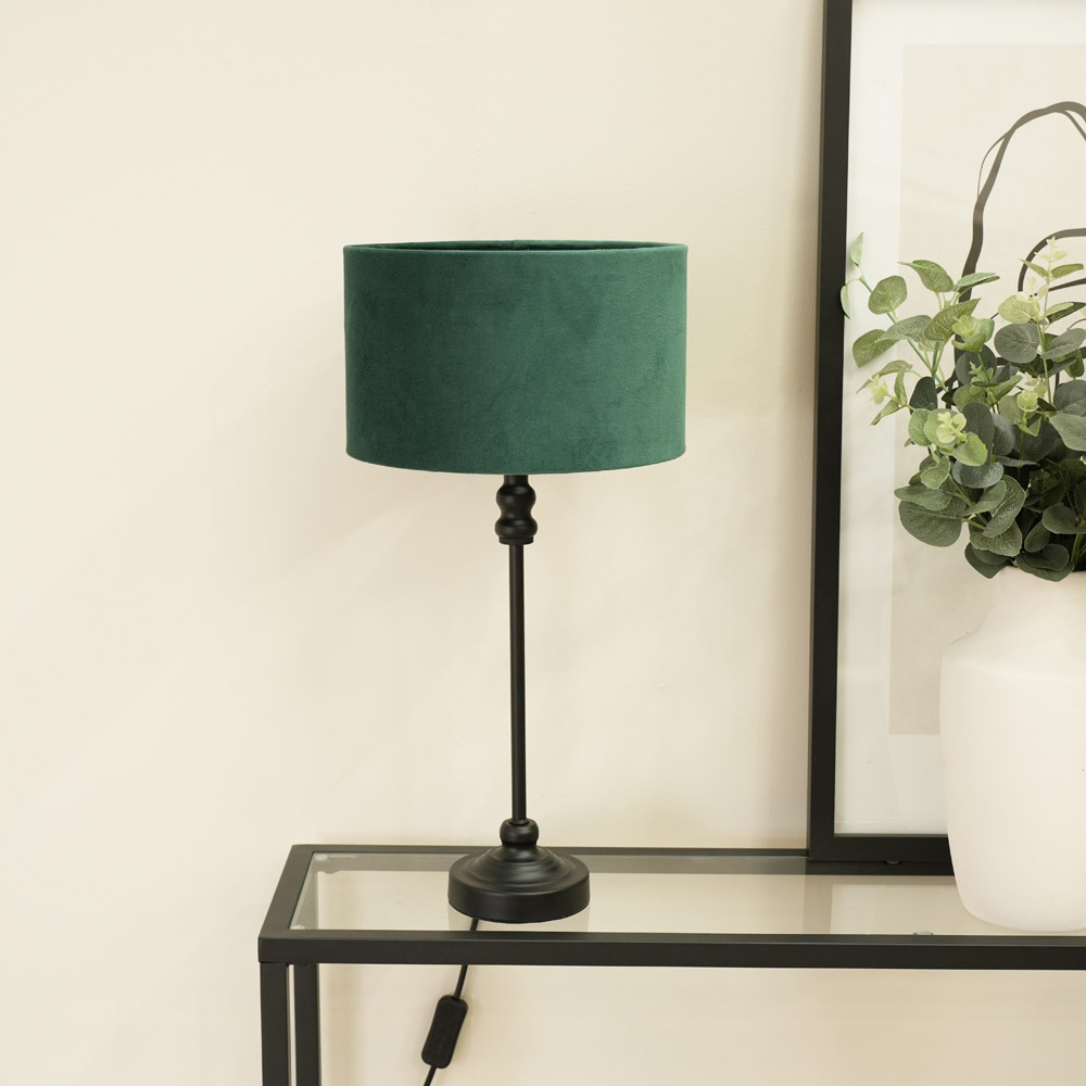 Brighten up your space with the ValueLights Maggie Forest Green Velvet and Black Drum Shade Candlestick LED Table Lamp. This sleek lamp features a slim black metal base, perfectly suited for smaller spaces and a forest green velvet drum shade that adds a warm, inviting touch. Equipped with an energy-efficient LED bulb, it is ready for immediate use. For added peace of mind, it includes a 12-month warranty, making it a reliable choice for any home. Dimensions: H50 x W25 x D25cm.