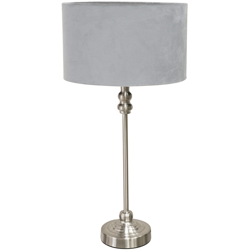 Illuminate your space with the ValueLights Maggie Grey Velvet and Brushed Chrome Drum Shade Candlestick LED Table Lamp. Featuring a sleek brushed chrome base, this table lamp fits effortlessly into smaller spaces while maintaining a refined look. The grey velvet drum shade gently diffuses the light to create a warm, inviting atmosphere. Equipped with an energy-efficient LED bulb, it is ready for immediate use. For added peace of mind, it includes a 12-month warranty, making it a reliable choice for any home. Dimensions: H50 x W25 x D25cm.