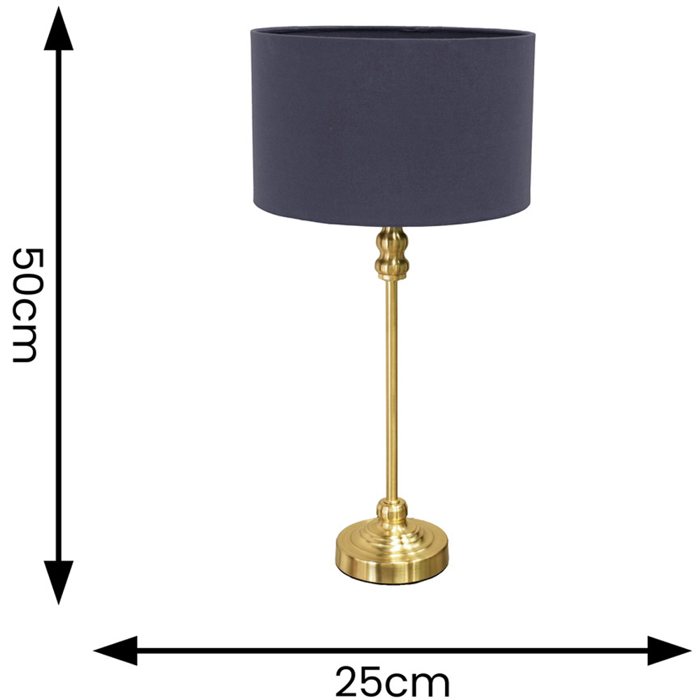 Bring a touch of glamour to your interior with the ValueLights Maggie Navy Blue and Gold Drum Shade Candlestick LED Table Lamp. Featuring a luxurious, slim gold base, this table lamp is designed for tighter spaces, making it an ideal addition to any room. The navy blue fabric drum shade adds a touch of elegance while softly diffusing the light to create a warm and inviting ambience. Equipped with an energy-efficient LED bulb, it is ready for immediate use. For added peace of mind, it includes a 12-month warranty, making it a reliable choice for any home. Dimensions: H50 x W25 x D25cm.