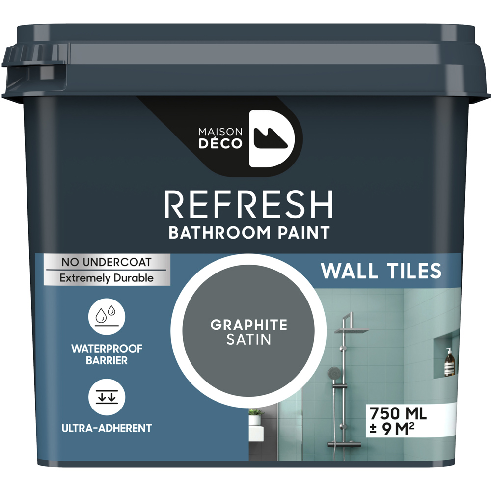 Breathe new life into your bathroom and update those tired, dated tiles with Maison Deco Refresh Bathroom Graphite Satin Paint 750ml. Refresh Bathroom Paint is specially designed to update tiled surfaces in heavy-use wet environments, including shower enclosures. Its formula creates a protective film that ensures high resistance to repeated exposure to water and changes in temperature. This low VOC paint is suitable over porcelain tiles, ceramic tiles, limestone/slate tiles, glass tiles, wood (varnished, painted), laminate and melamine. Refresh Bathroom Paint requires no undercoat, adhering directly to difficult surfaces such as tiles. Simply apply two coats with a short pile roller or brush to easily transform bathroom surfaces. Note: melamine and previously coated wood will require sand before applying. With a passion for colour and finishes, Maison Deco combines technical know-how and decoration expertise to make renovation projects more than just a dream. The Refresh range allows you to breathe new life into your interiors, inspiring endless possibilities for renovation. Say goodbye to drab and dated decor and Refresh and liven up your Home.